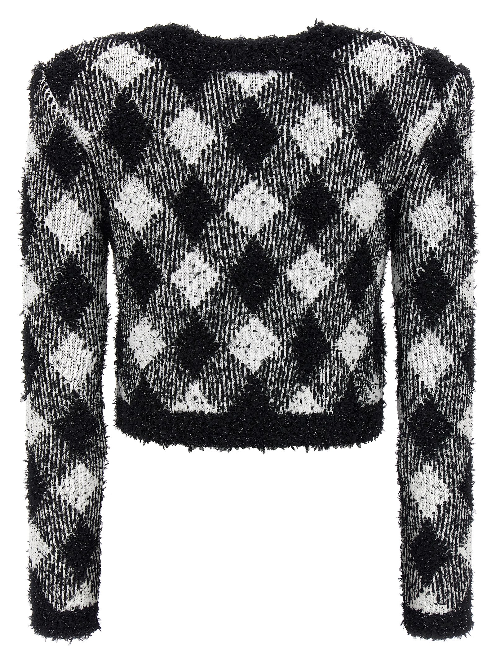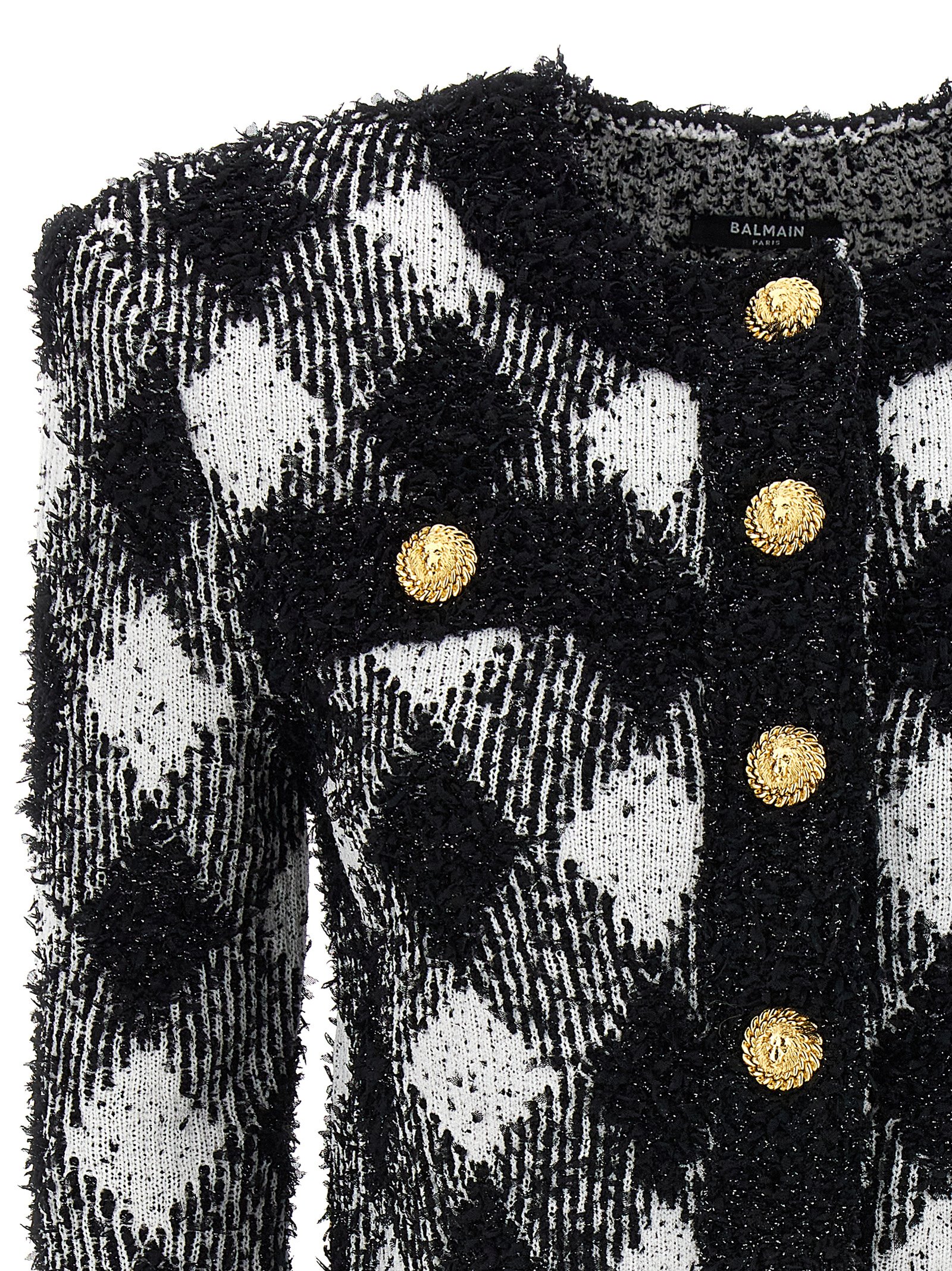 Short jacket in lurex tweed with macro vichy print, crew neck, padded shoulders, long sleeves, gold metal closure and button appliqué.