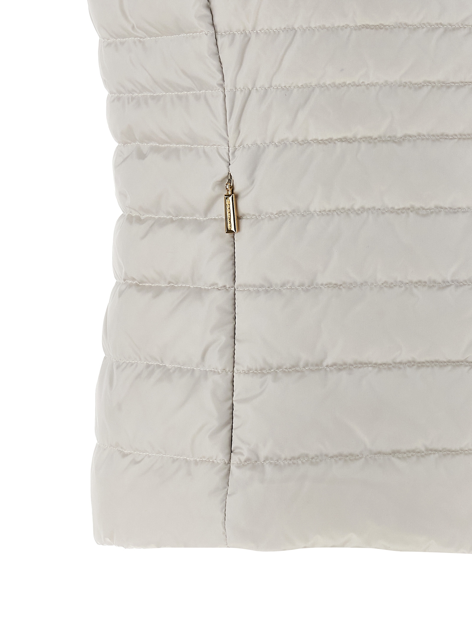 ‘Villan’ vest in polished technical fabric quilted and goose feather padding, standing collar with removable hood, front zip closure, pockets.
