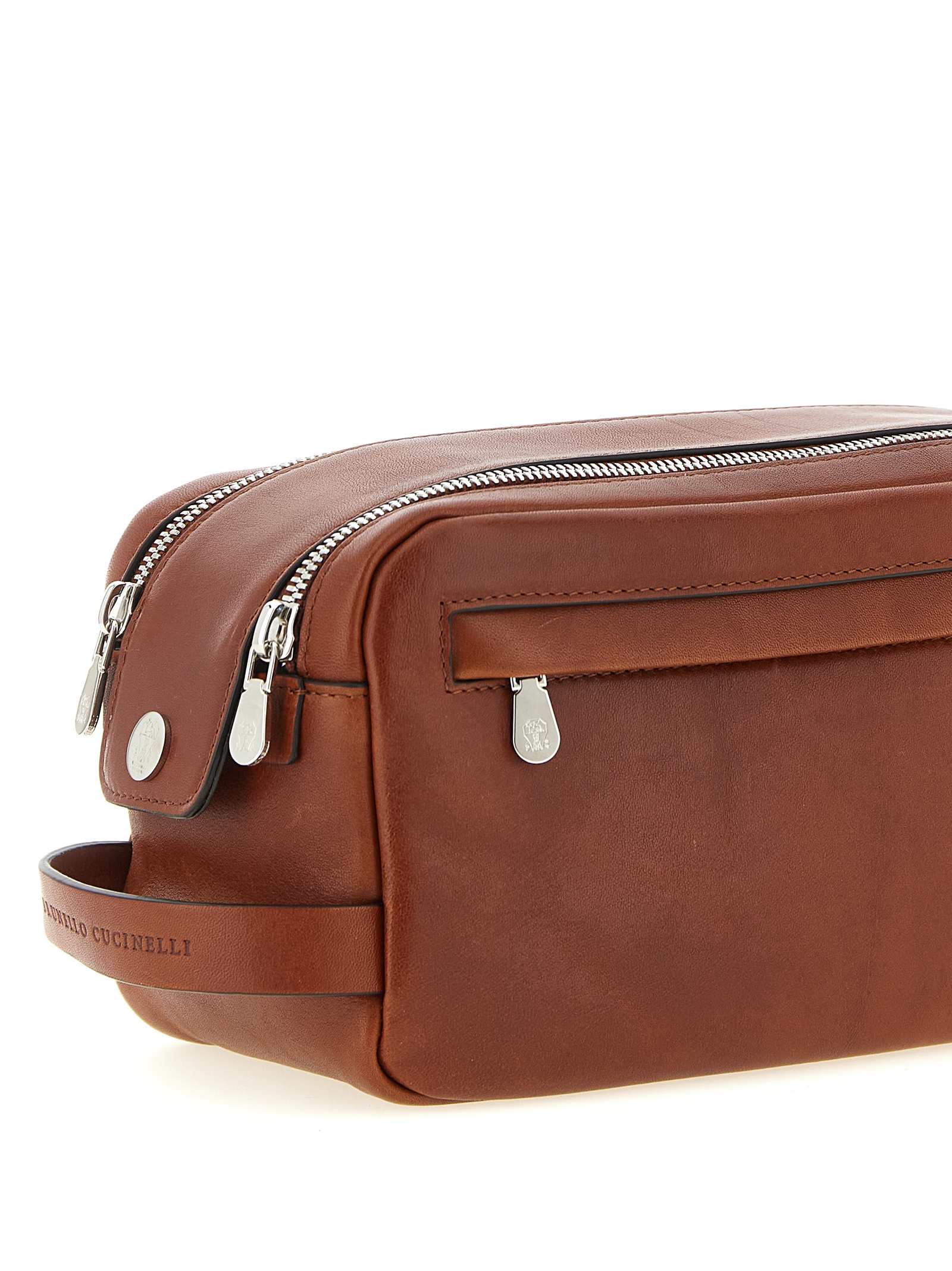 Cowhide leather beauty with a semi-gloss texture and vintage taste, handle with embossed logo, double top zip with magnetic closure, front zip pocket, water-repellent fabric lining, and an inner pocket.