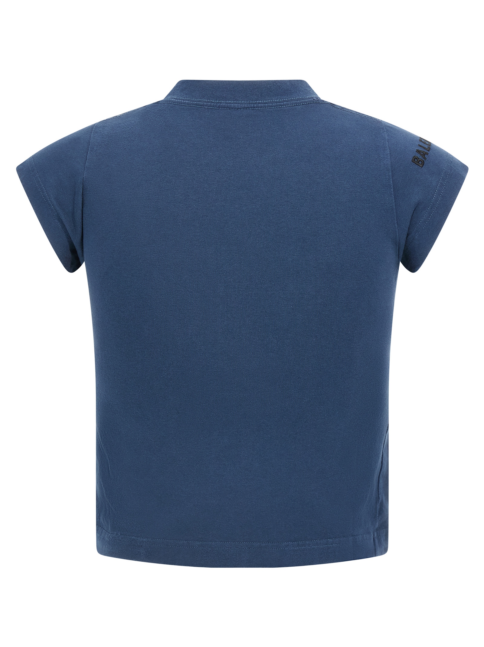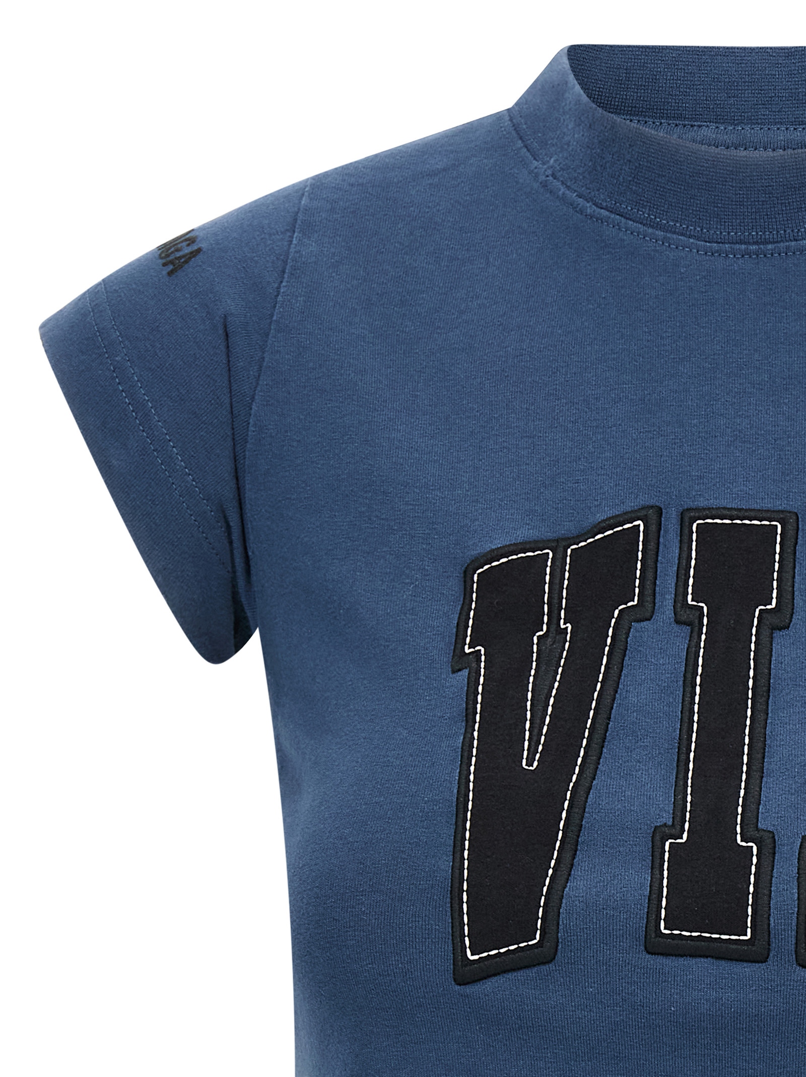 Used effect stretch peeling jersey T-shirt, front ‘VIP Team Logo’ patch, crop model, crew neck, short sleeves.