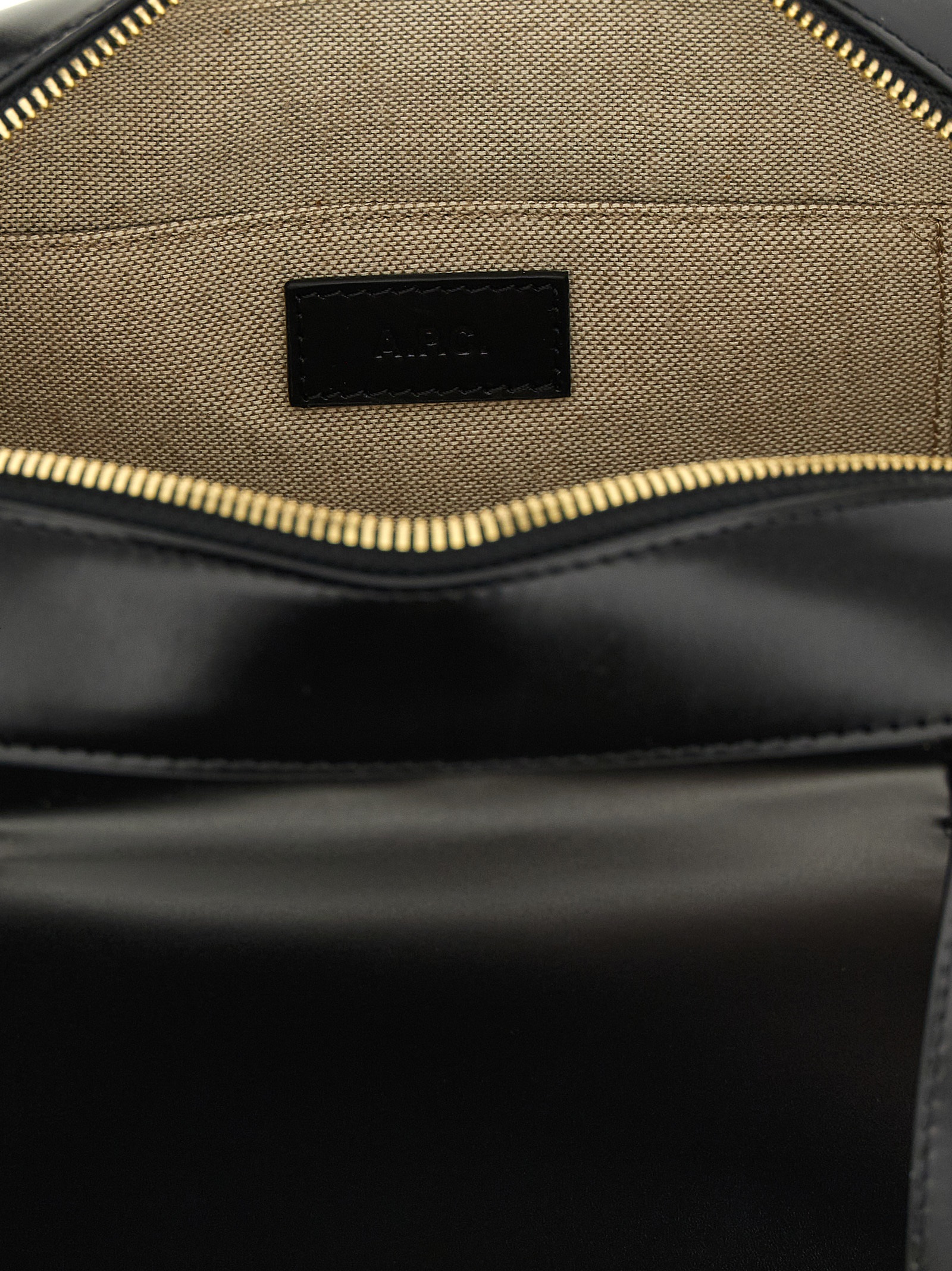 ‘Virginie Box’ smooth leather handbag, front embossed ‘A.P.C. Rue Madame Paris’ logo, top zip closure, double adjustable handle, cotton lining, adjustable and removable shoulder strap.