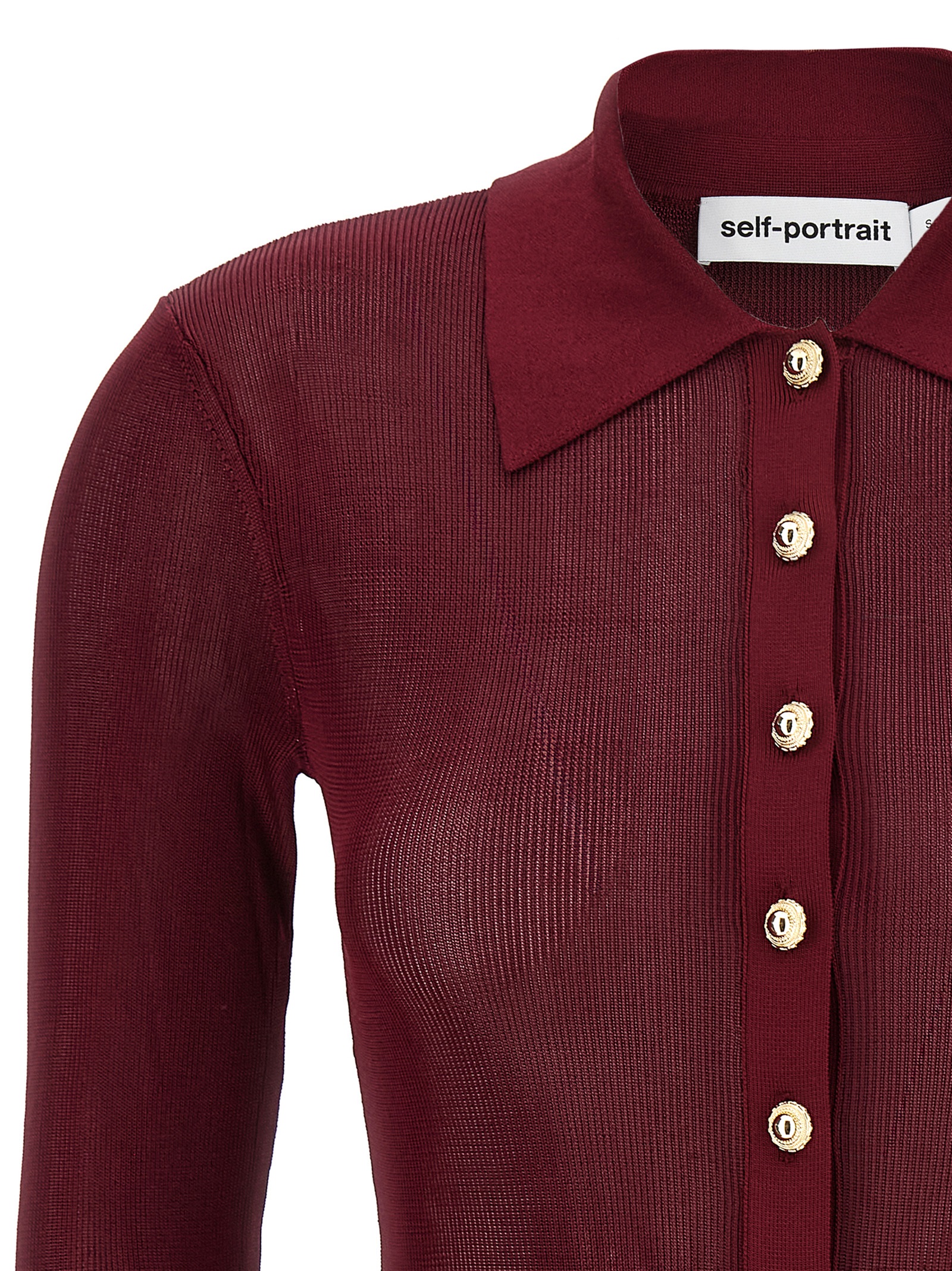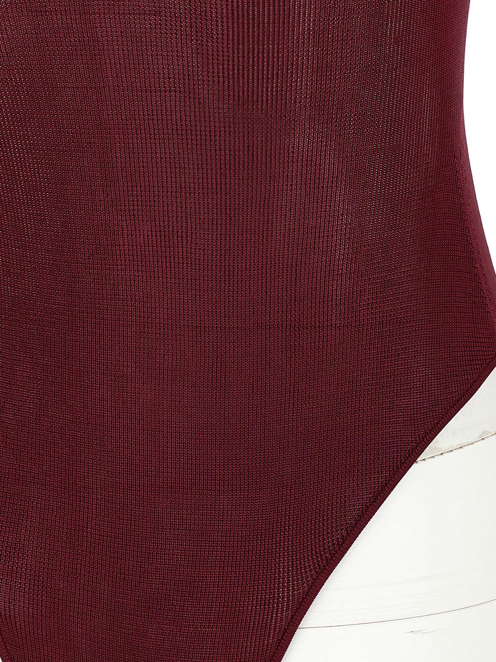 Stretch viscose knit polo shirt bodysuit with collar and front button closure, long sleeves, snap buttons on the hem.
