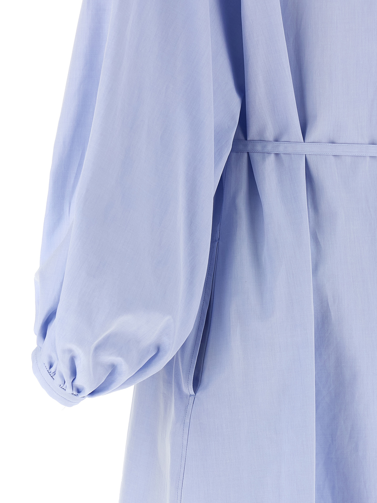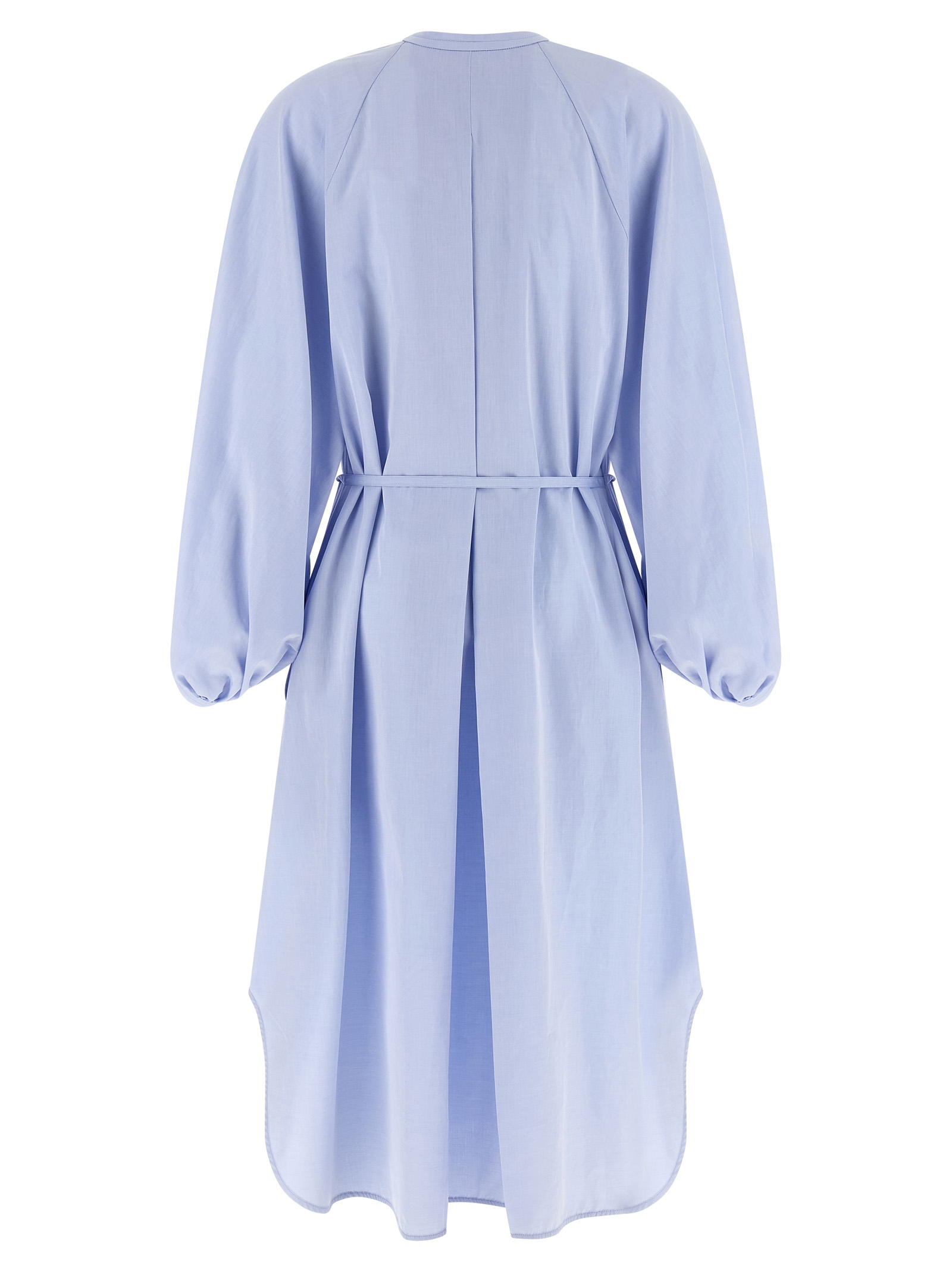 ‘Vitti’ midi dress in cool cotton poplin style, chemisier model, crew neck, front button closure, pockets, long raglan sleeves wide puff with cuffs, side slits, asymmetrical hem, removable belt.