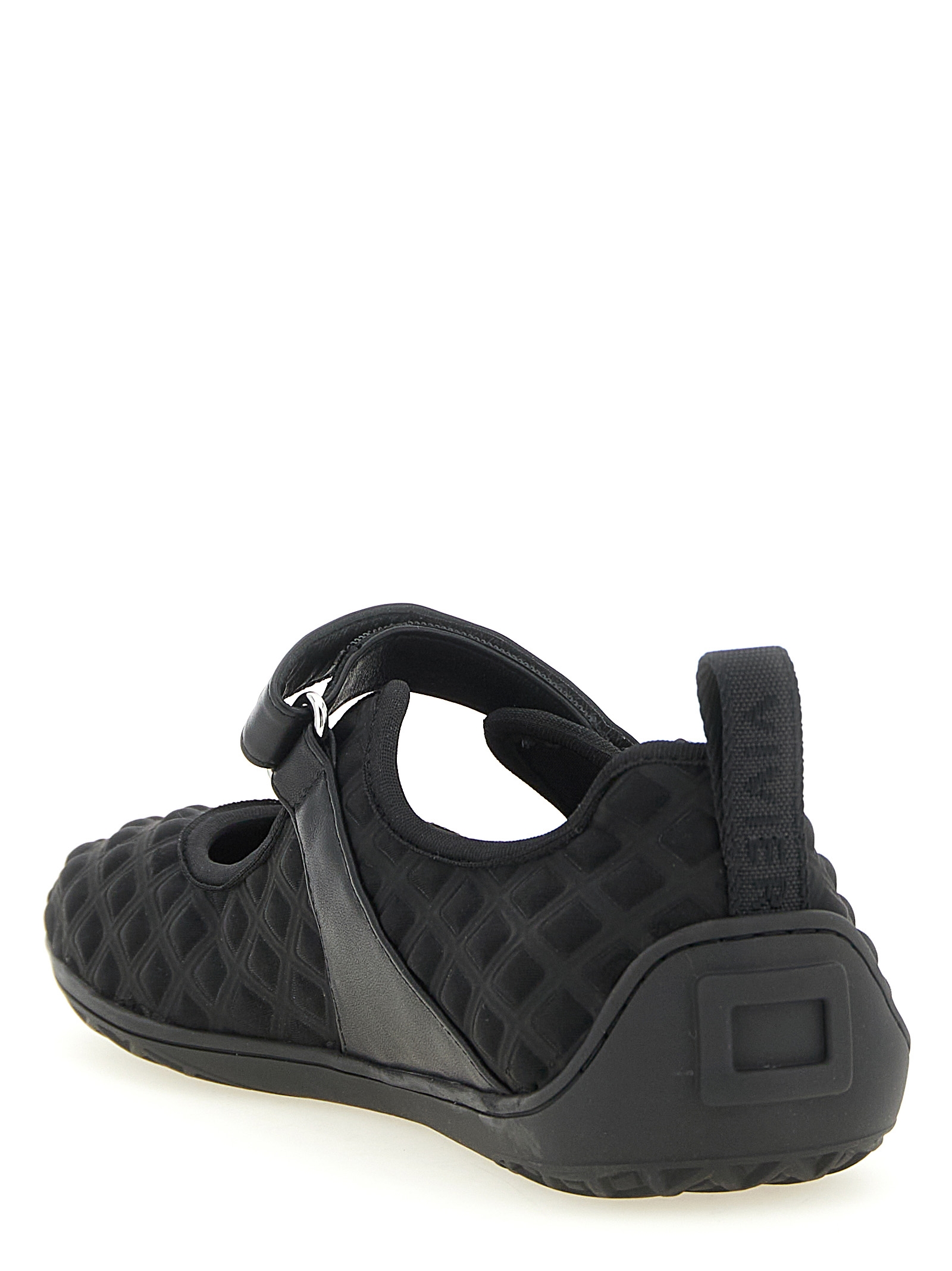 ‘Viv Low’ scuba effect fabric ballet flats with diamond pattern, adjustable tone-on-tone leather strap with velcro and crystal buckle, fabric insole, rubber sole.