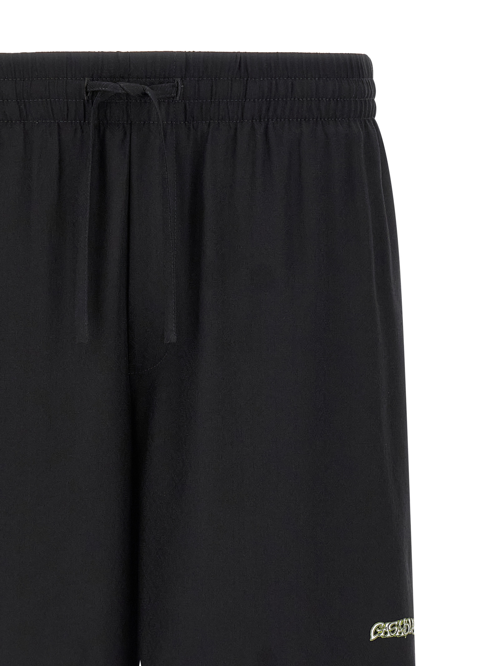 Jacquard monogram silk bermuda shorts, front logo print, back ‘Volcano’ print, drawstring elastic waistband, trompe l’oeil flap, pockets.