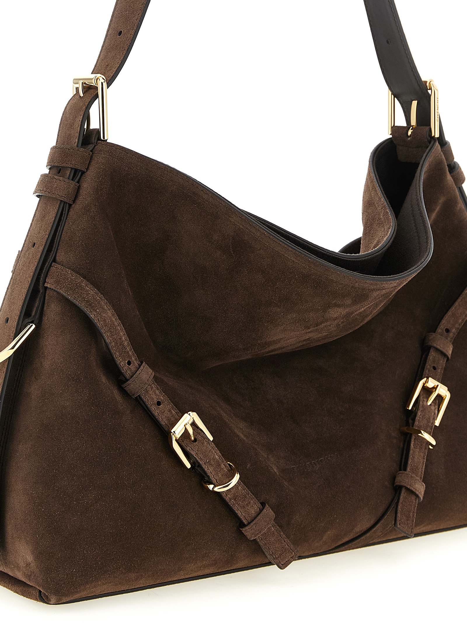 Medium suede shoulder bag, ‘Voyou’ line, soft V-silhouette, embossed logo and strap detail with metal buckles on the front, adjustable handle, canvas lining, one inner pocket.