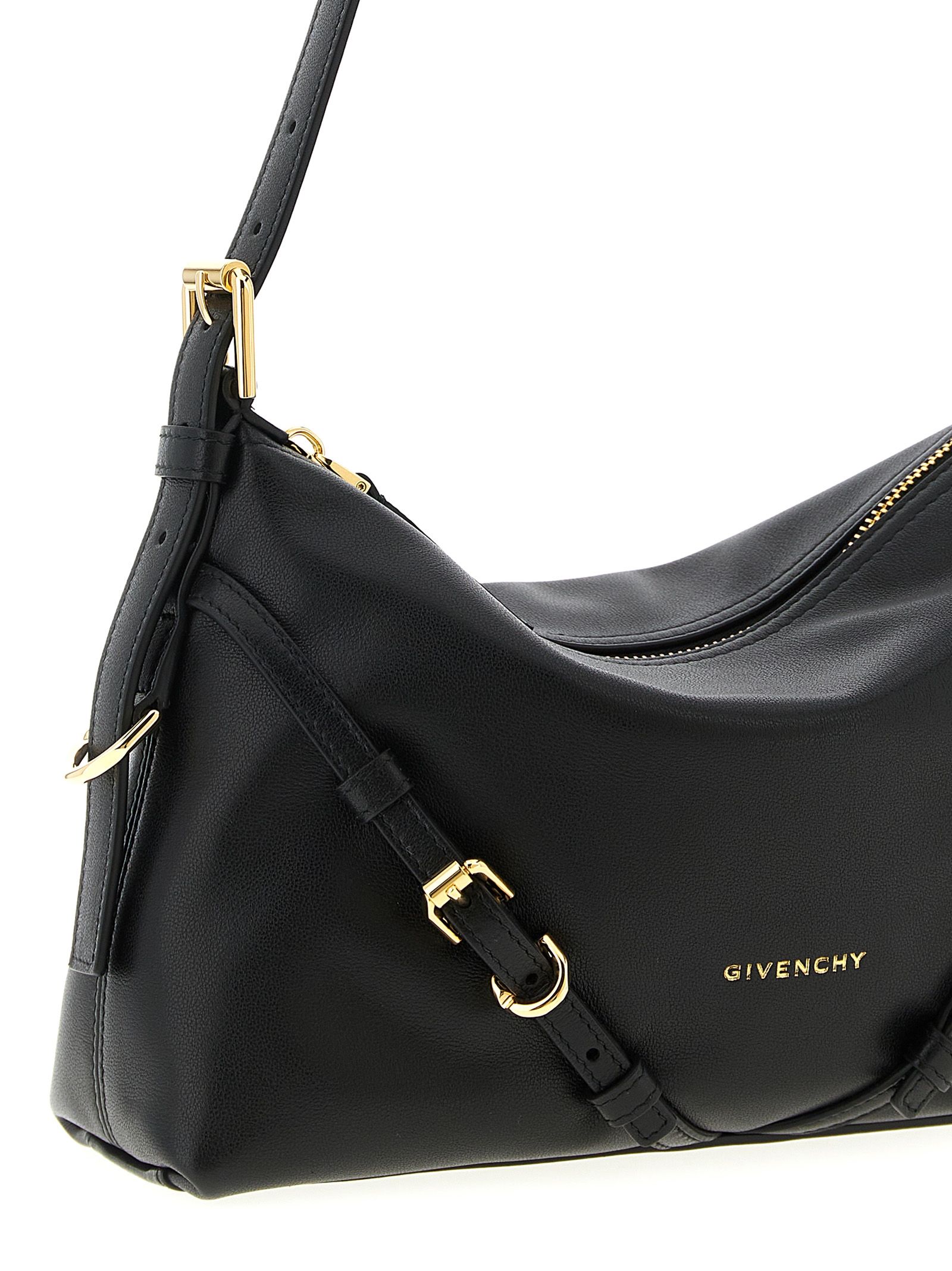 Mini shoulder bag in smooth and shiny calf leather, ‘Voyou’ line, embossed logo and front strap detail, top zip closure, adjustable handle, canvas lining.