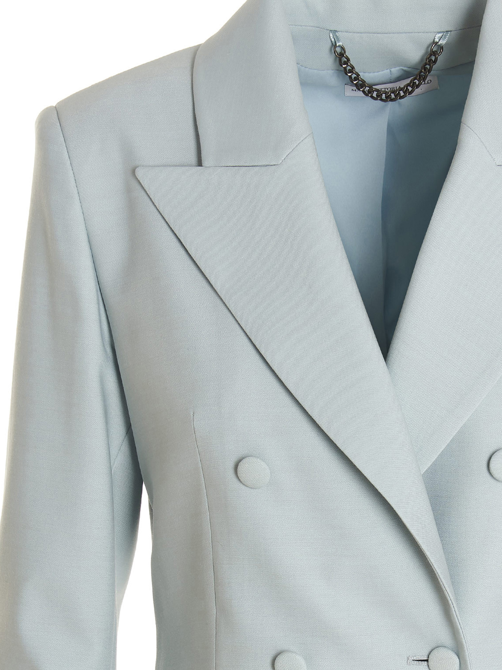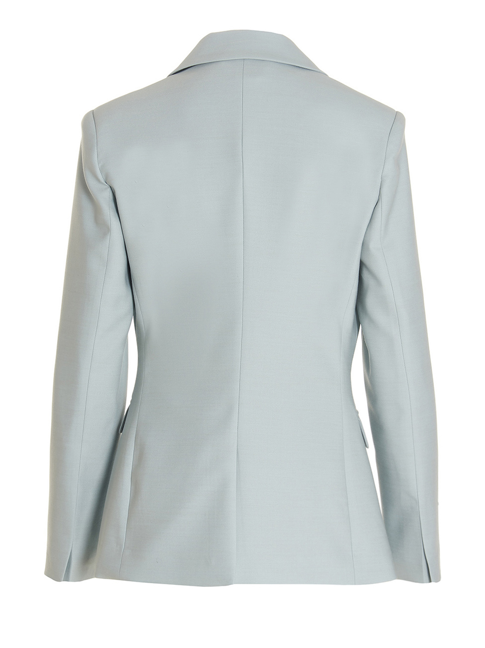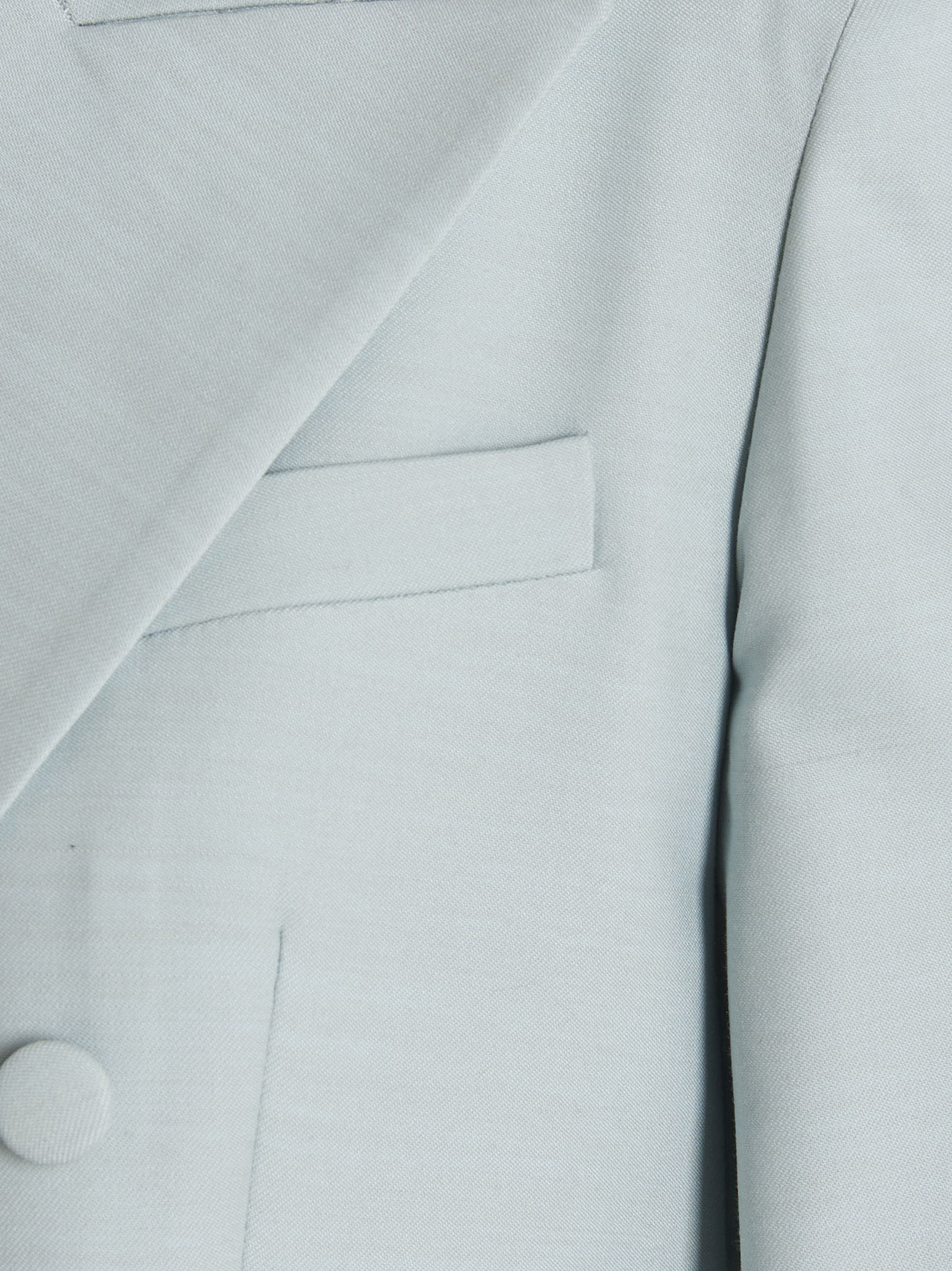 Waldof’ wool blend double-breasted blazer with button closure, peak lapels, pockets, padded shoulders, long sleeves and a back split.