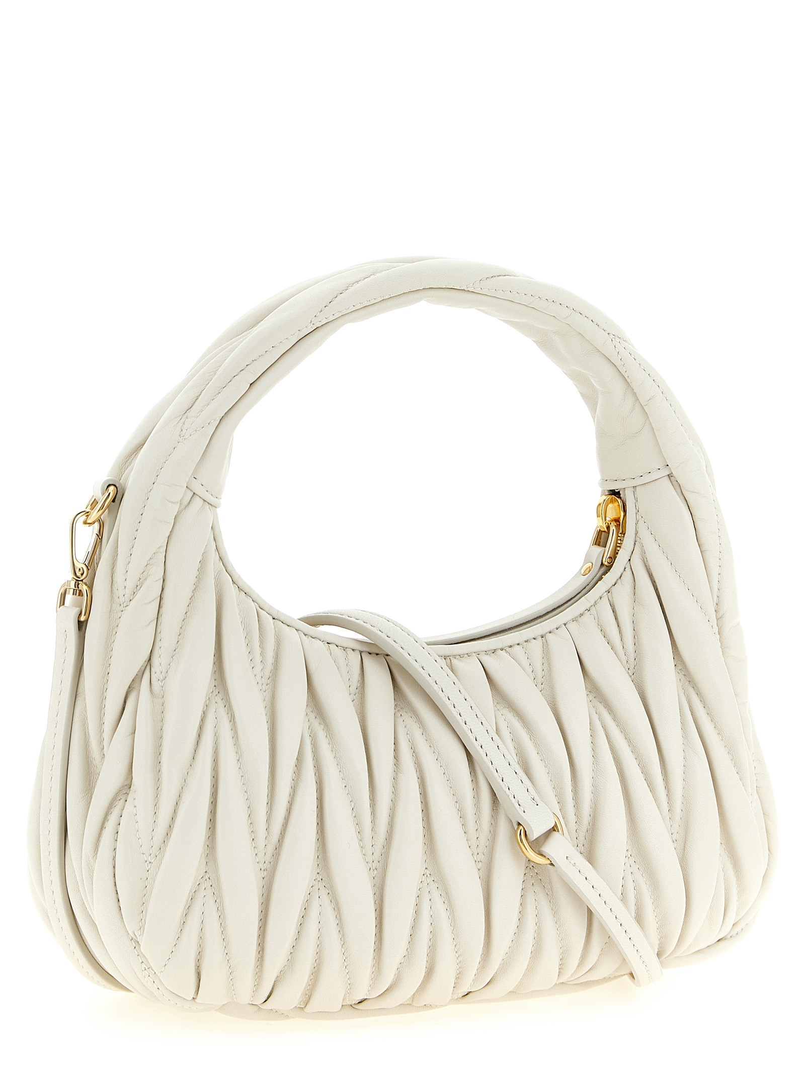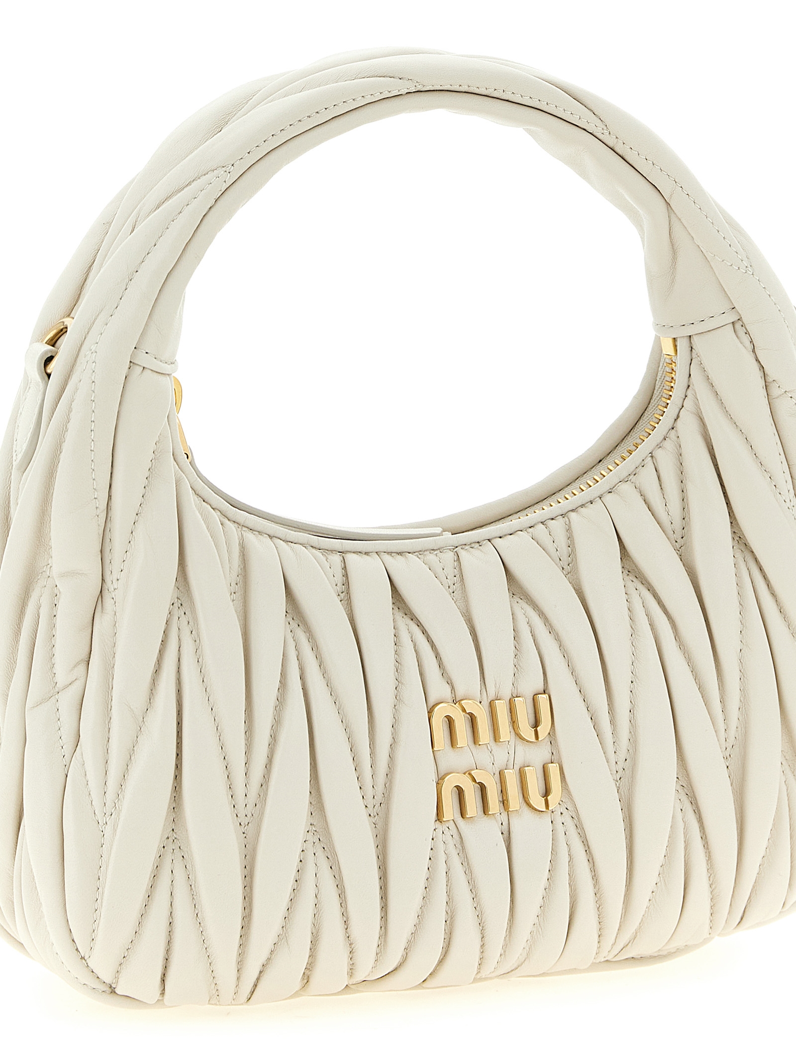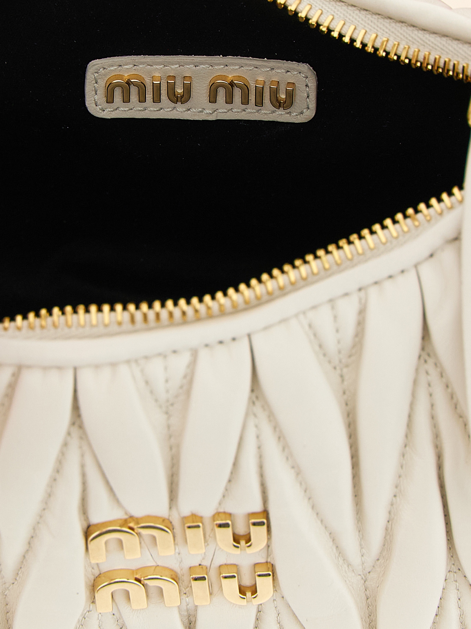‘Wander’ matelassé nappa leather handbag, hobo silhouette, front metal lettering logo, top zip closure, fixed handle, cotton satin lining, adjustable and removable shoulder strap.