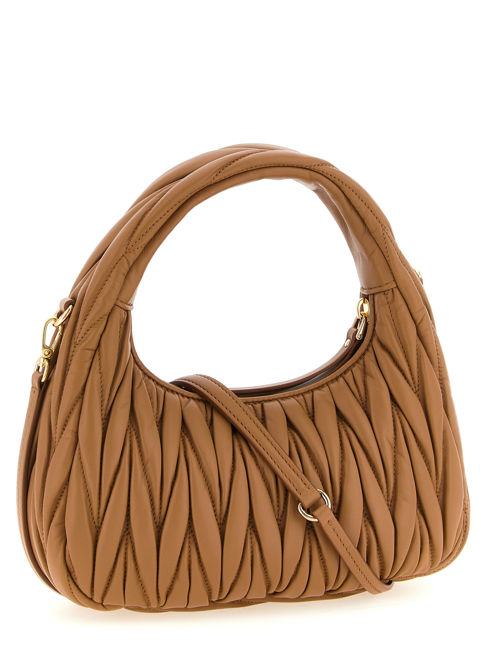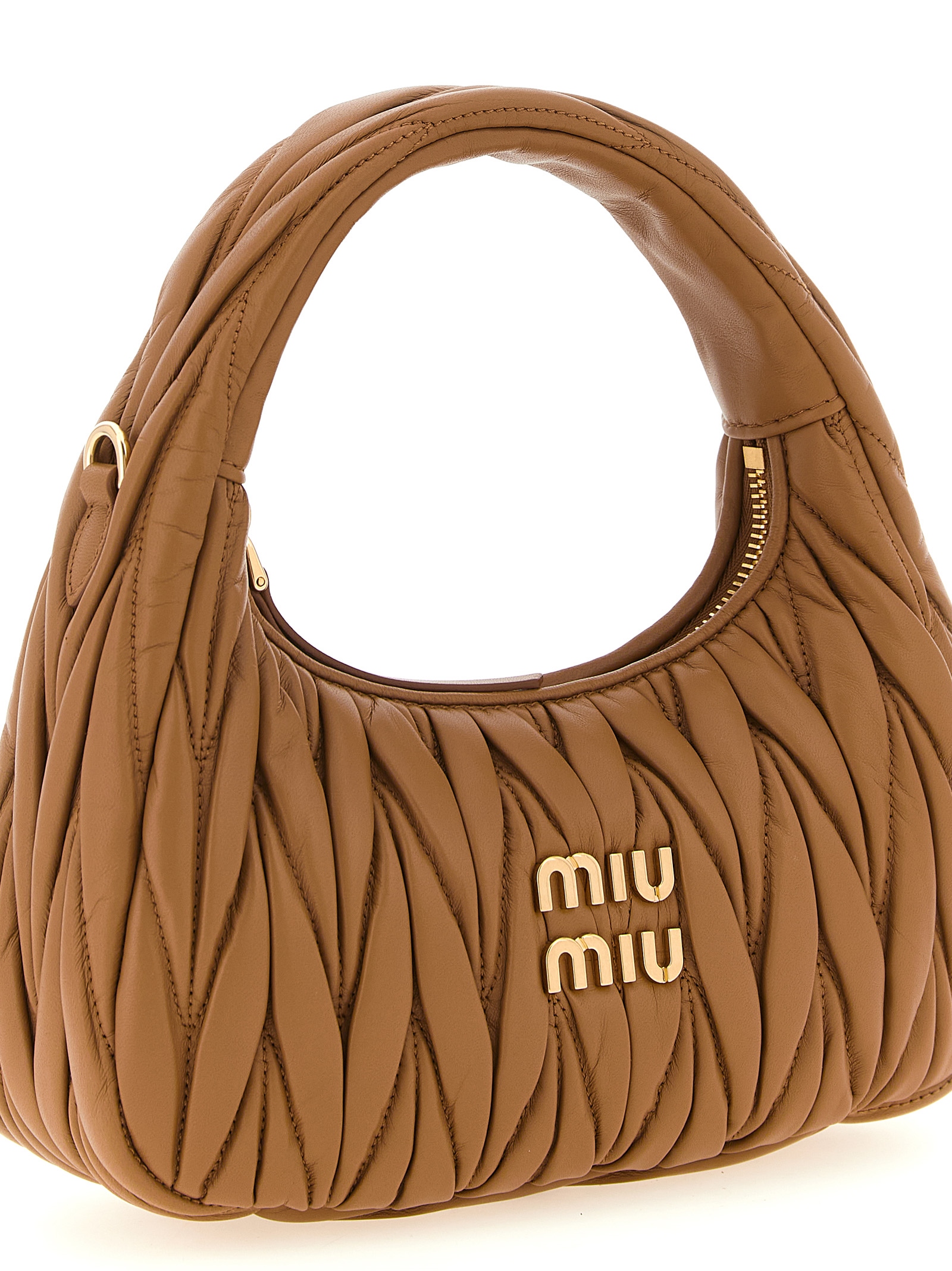 ‘Wander’ matelassé nappa leather handbag, hobo silhouette, front metal lettering logo, top zip closure, fixed handle, cotton satin lining, adjustable and removable shoulder strap.