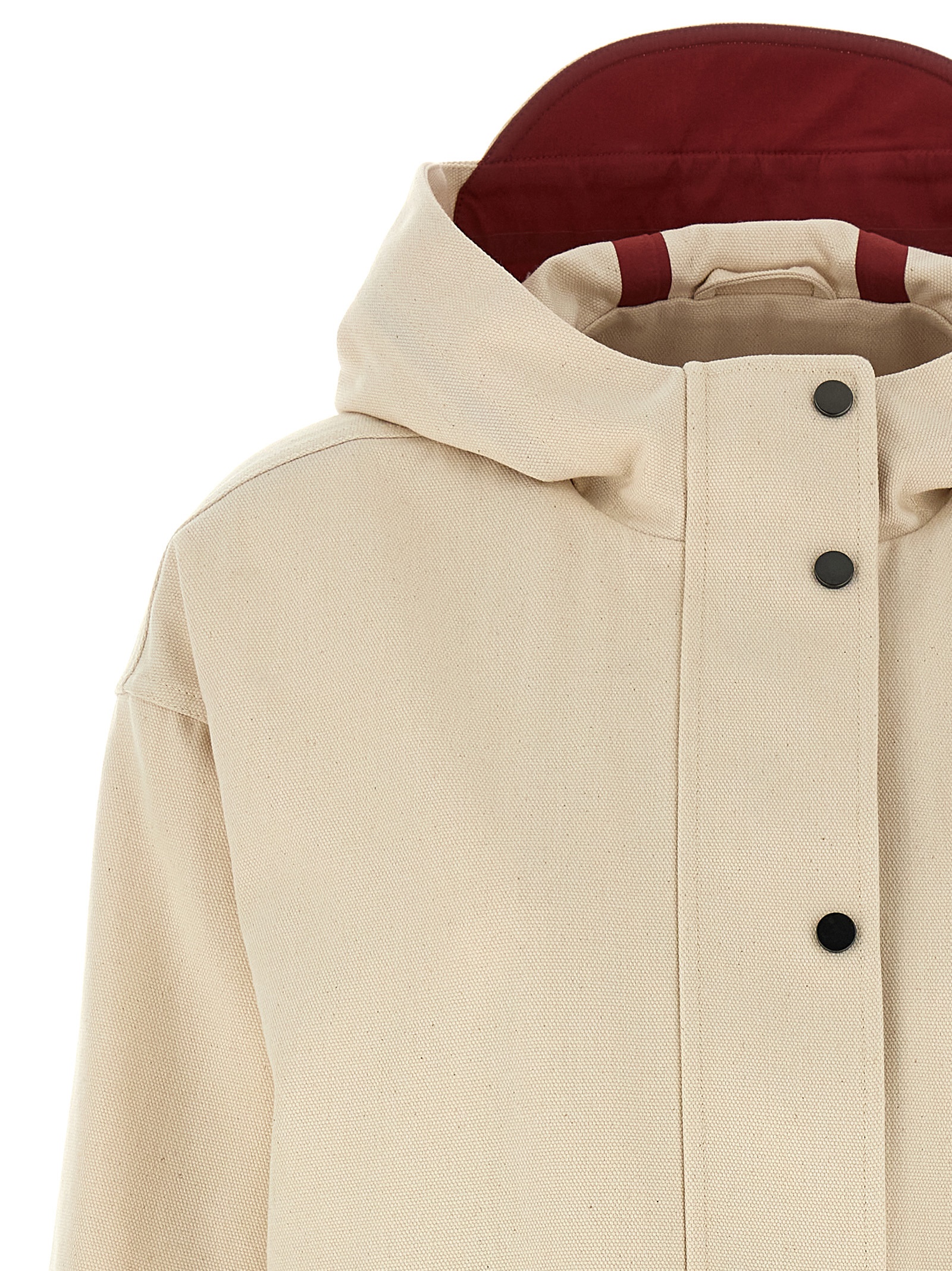 Water-repellent cotton canvas jacket with heat sealing, unlined, hood, zip closure with Monile puller and front snap buttons, pockets, long sleeves with cuffs.