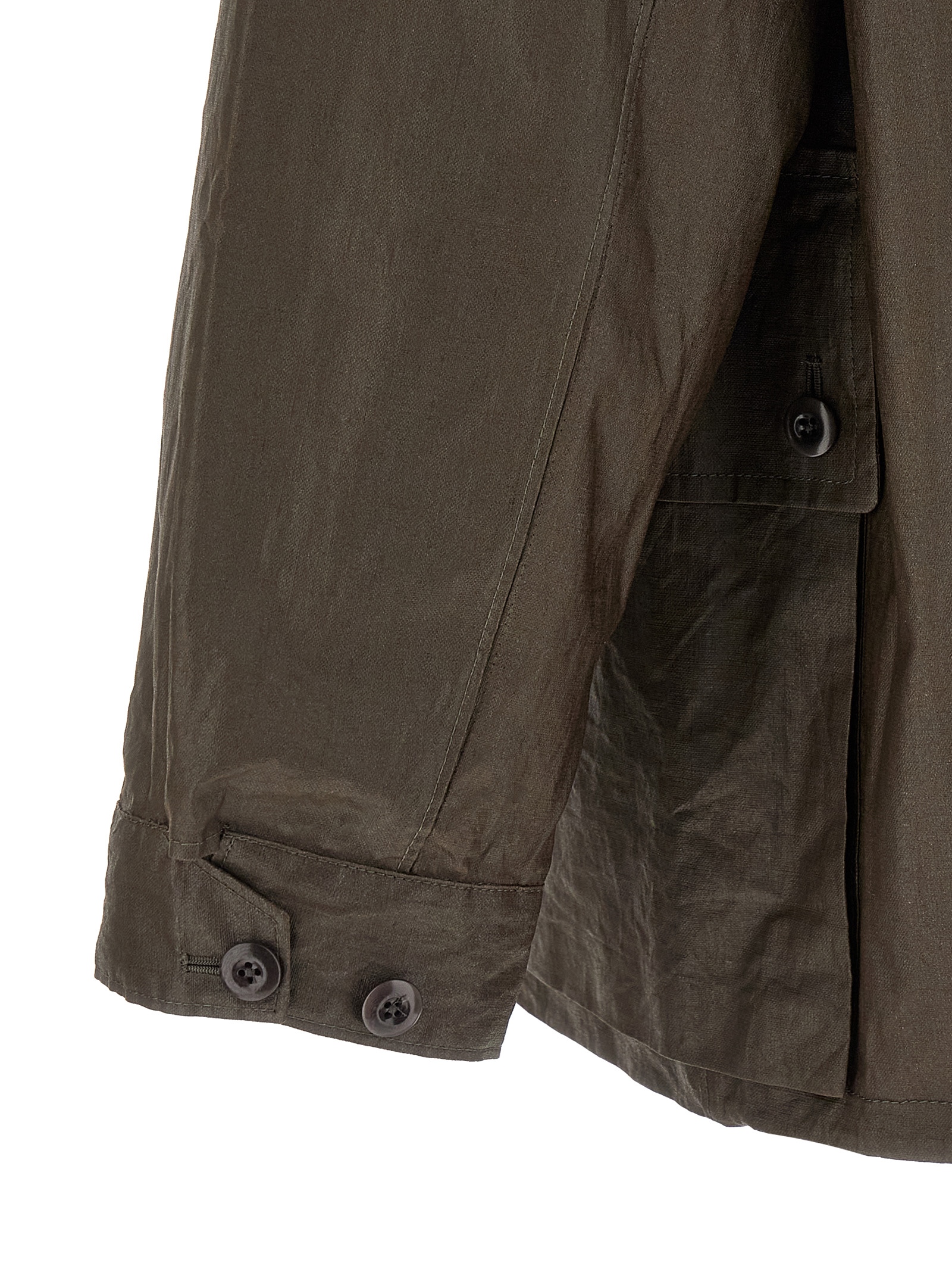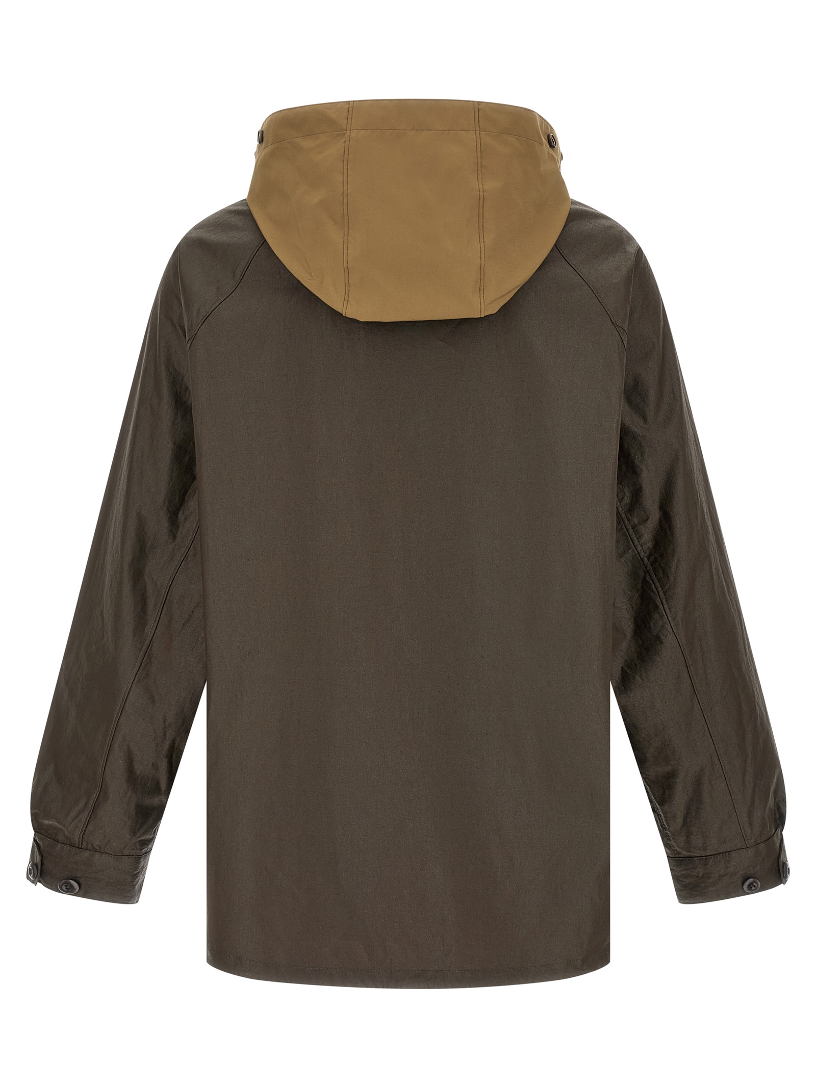 Waterproof jacket in coated technical linen with water-repellent treatment that gives a waxed and cracked effect, removable hood in contrast FAN® cotton, shirt collar, zip closure and hidden snap buttons on the front, pockets, long raglan sleeves with adjustable cuffs, unlined.