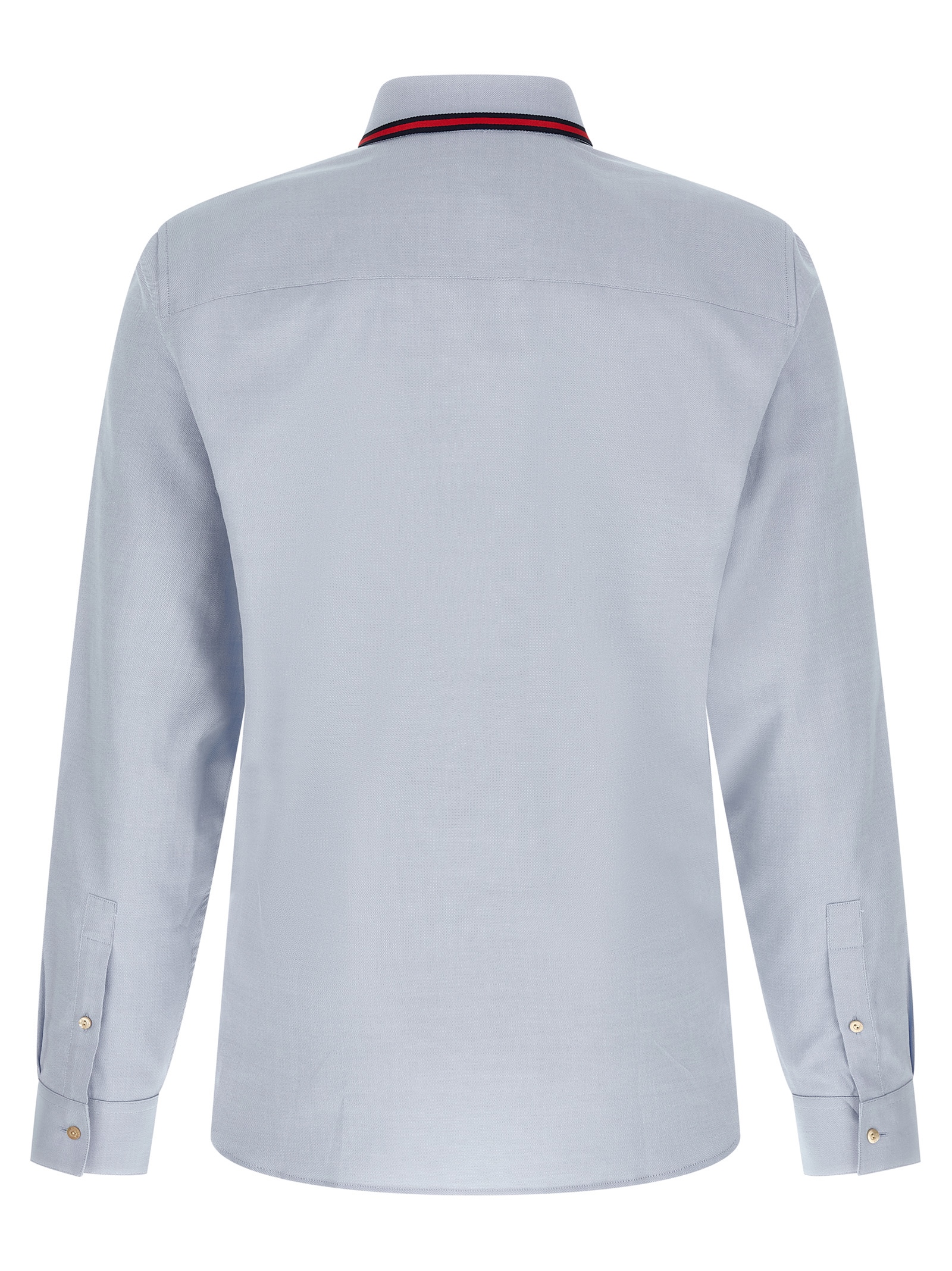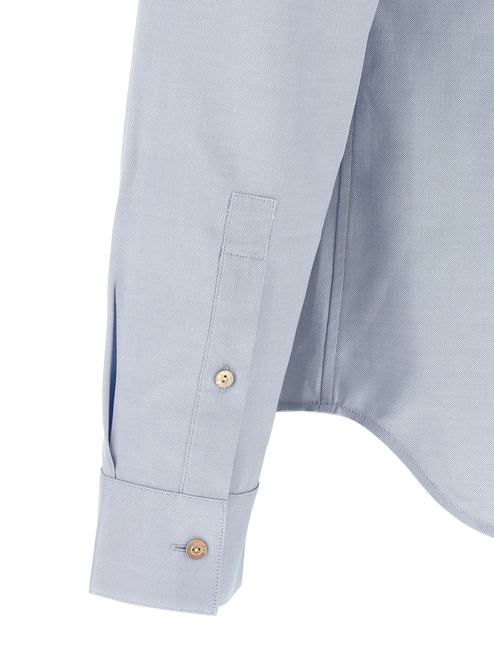 Oxford cotton shirt with pointed collar with ‘Web’ finish, breast pocket, front mother-of-pearl button closure, long sleeves with cuffs and slightly dropped shoulder, rounded hem.