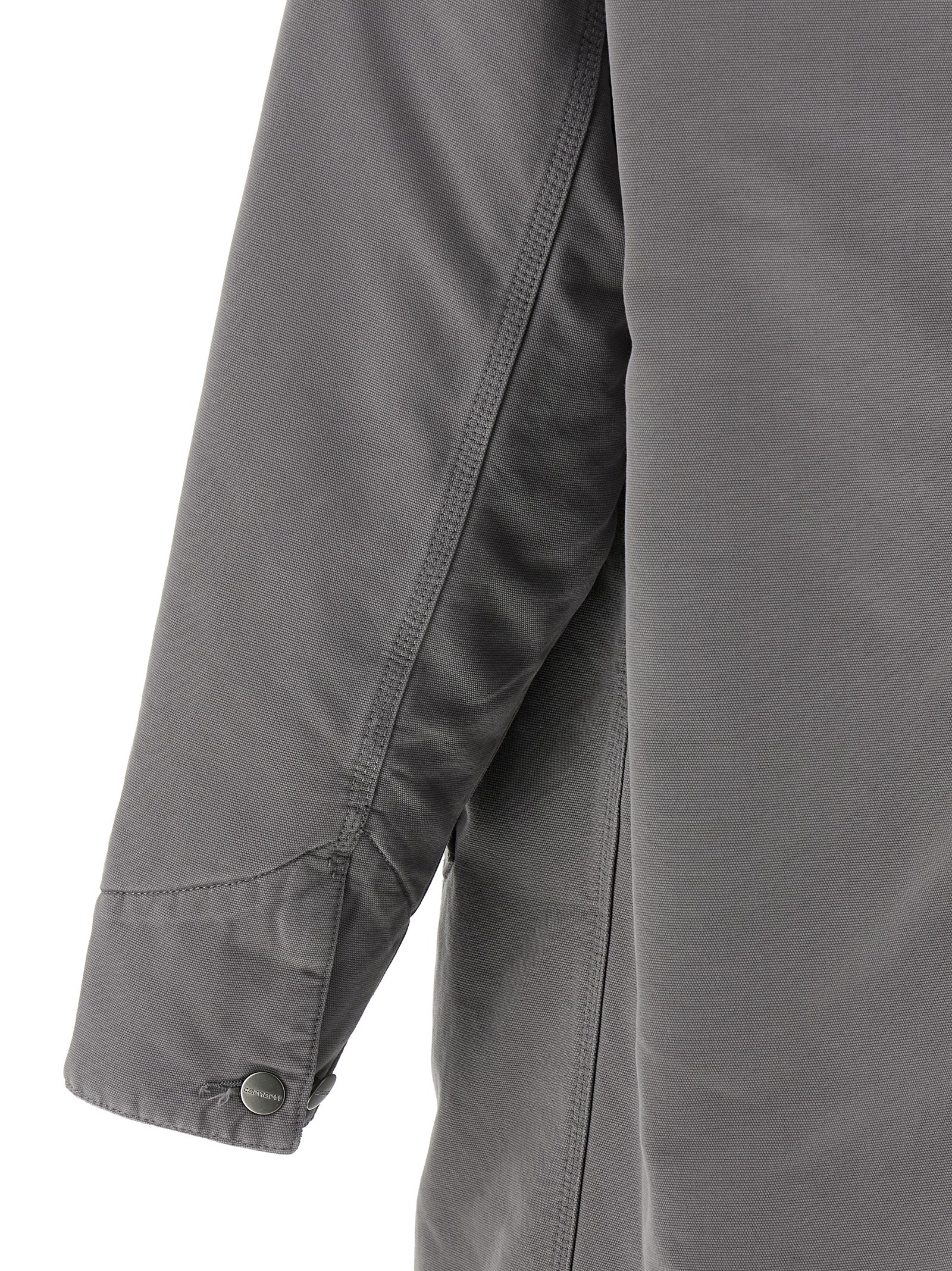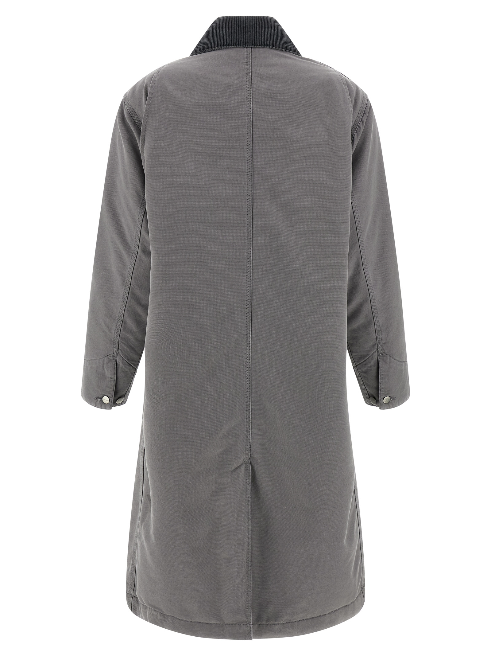 ‘Webster’ long coat in medium-weight cotton canvas, diamond-shaped nylon lining, tone-on-tone corduroy shirt collar, logo patch and front button closure, pockets, long cuffed sleeves, back vent.