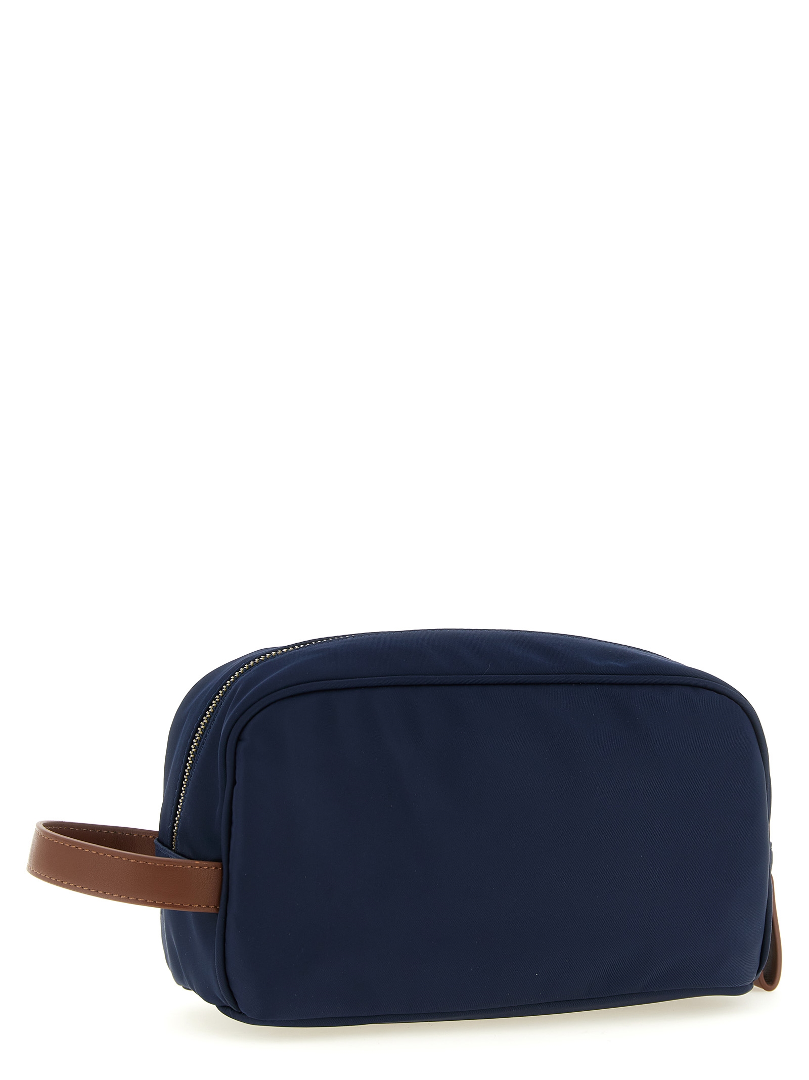 Nylon and leather-effect fabric Westwood beauty, contrast front logo embroidery, top zip closure, handle, striped waterproof TPU lining.