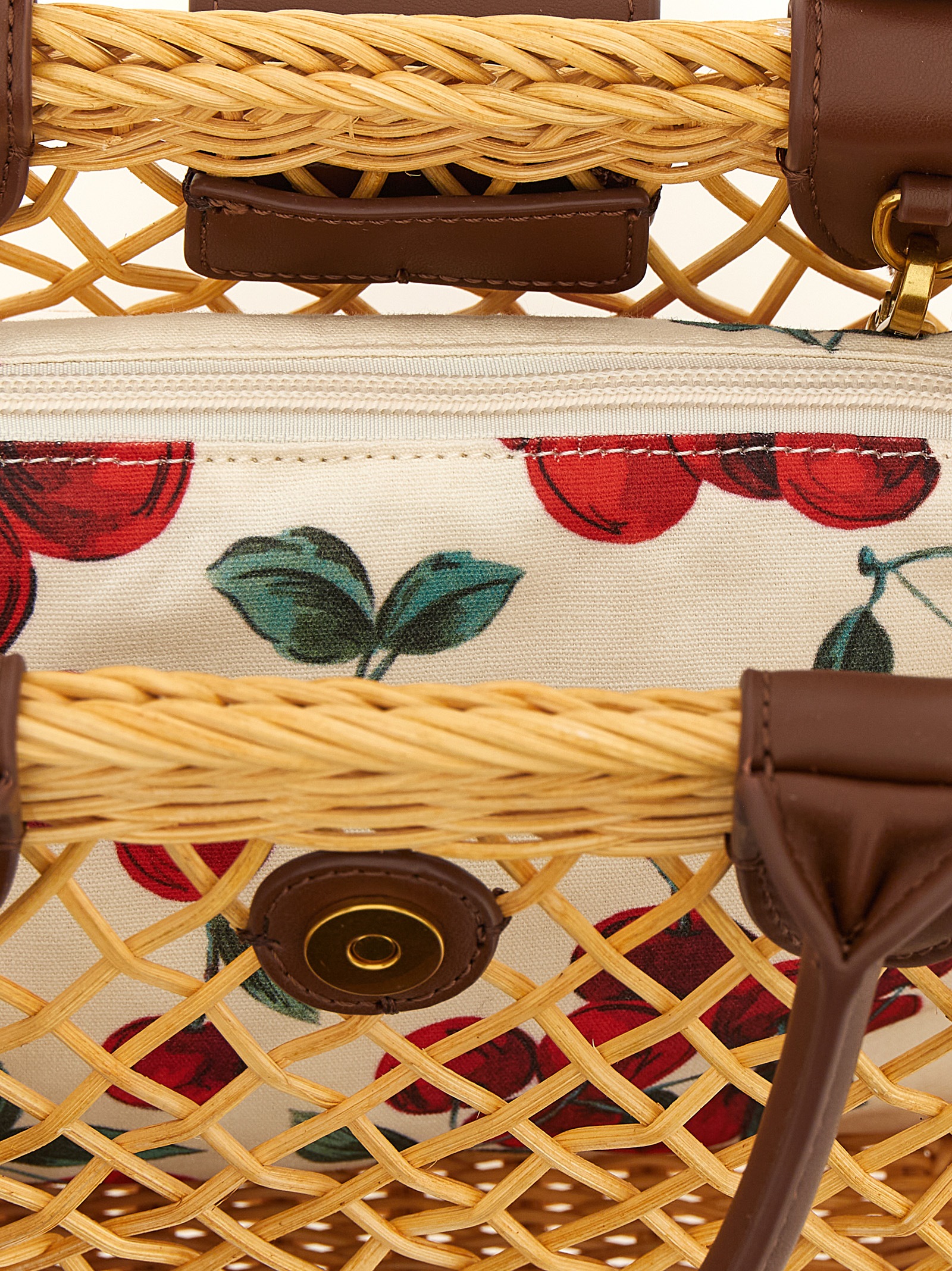 Hand-woven wicker shoulder strap with contrasting smooth leather-effect fabric details, basket design, interior clutch bag in patterned canvas, magnetic closure with front metal logo strap, double fixed handle, adjustable and removable shoulder strap.