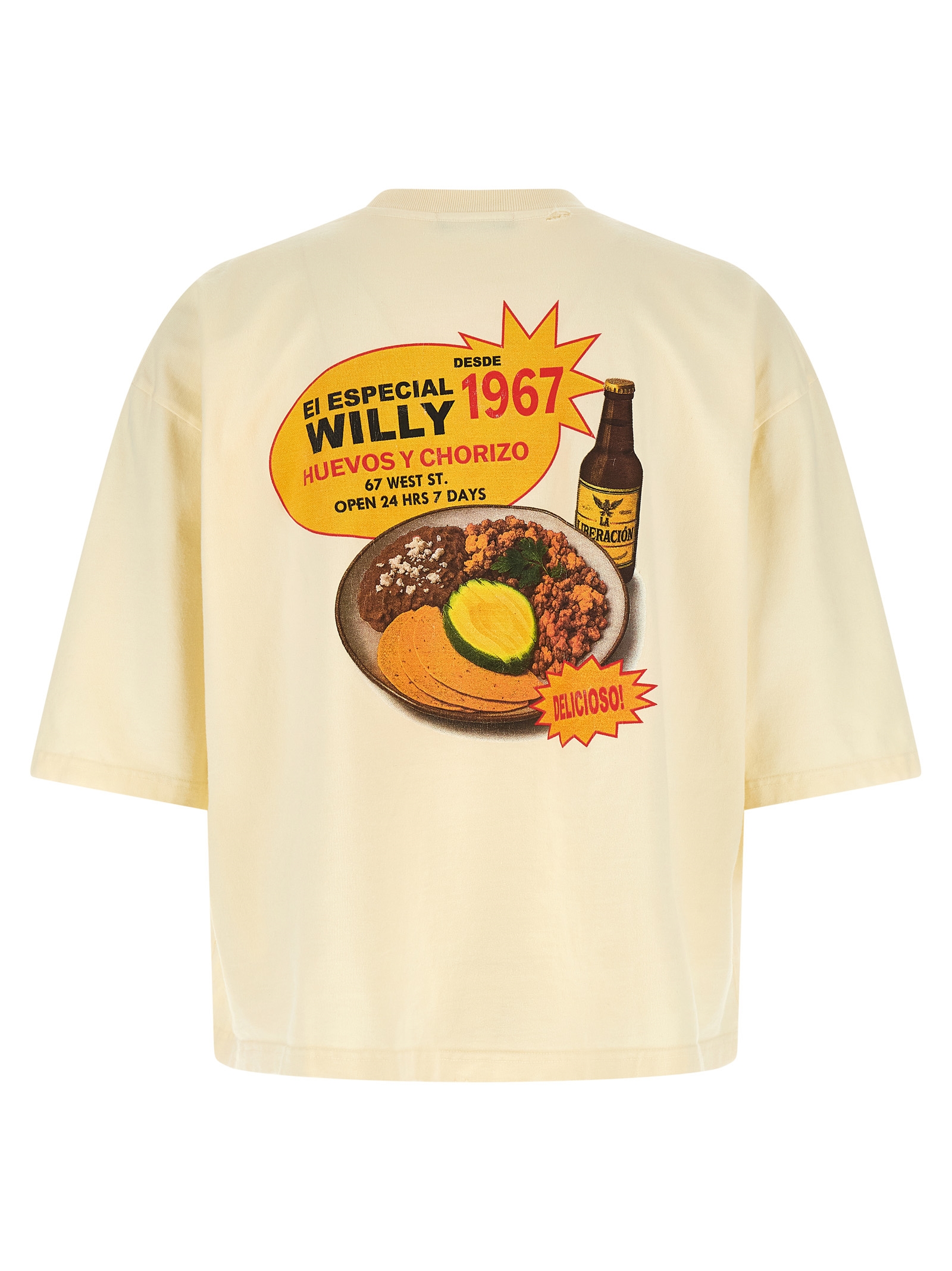‘Willy’s Taco Shop – Buffalo’ cotton t-shirt with rips, print on the front and back, crew neck, short sleeves with dropped shoulders.