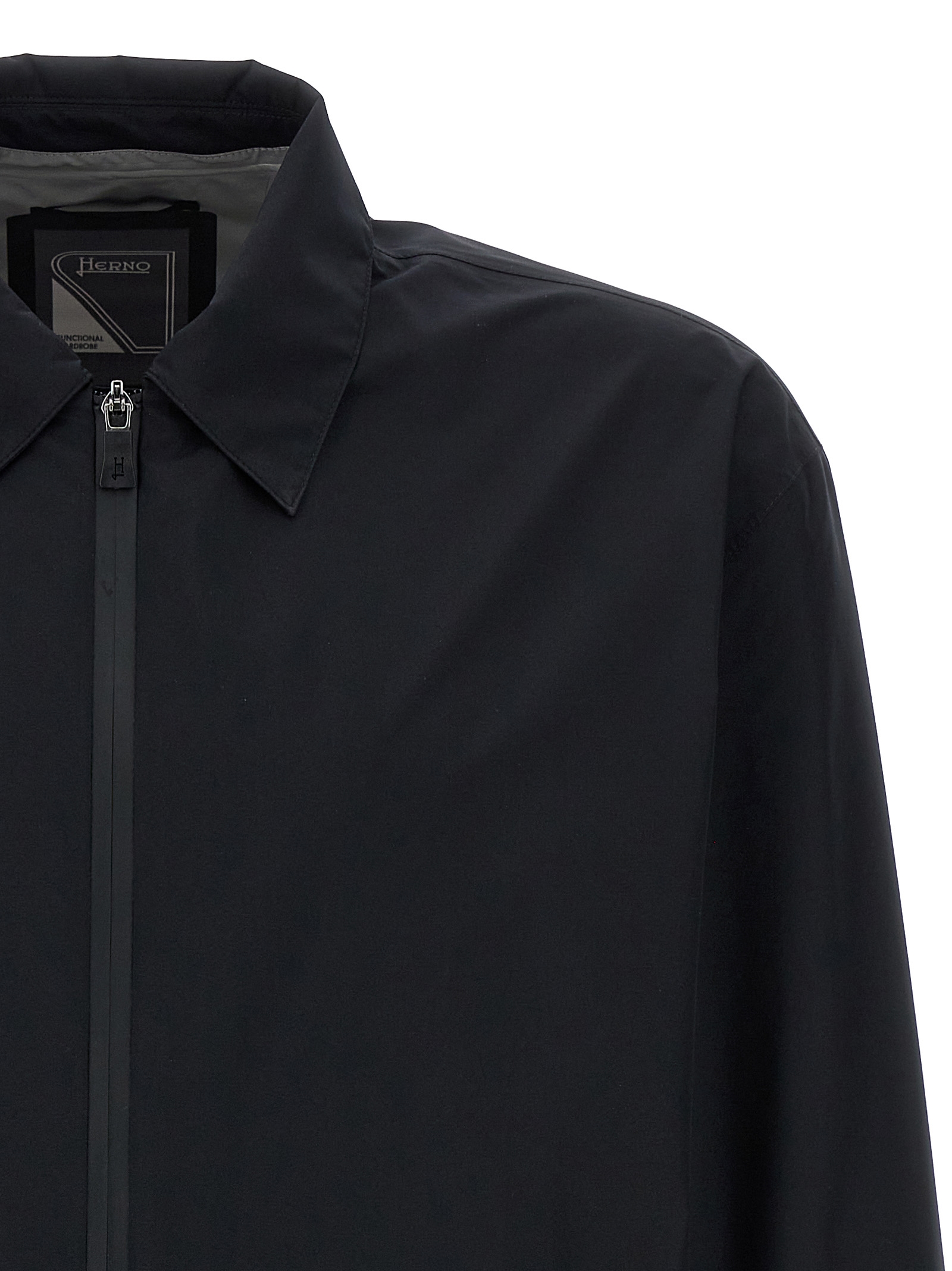Windproof technical fabric jacket, collar, zip closure, pockets, long sleeves with cuffs.