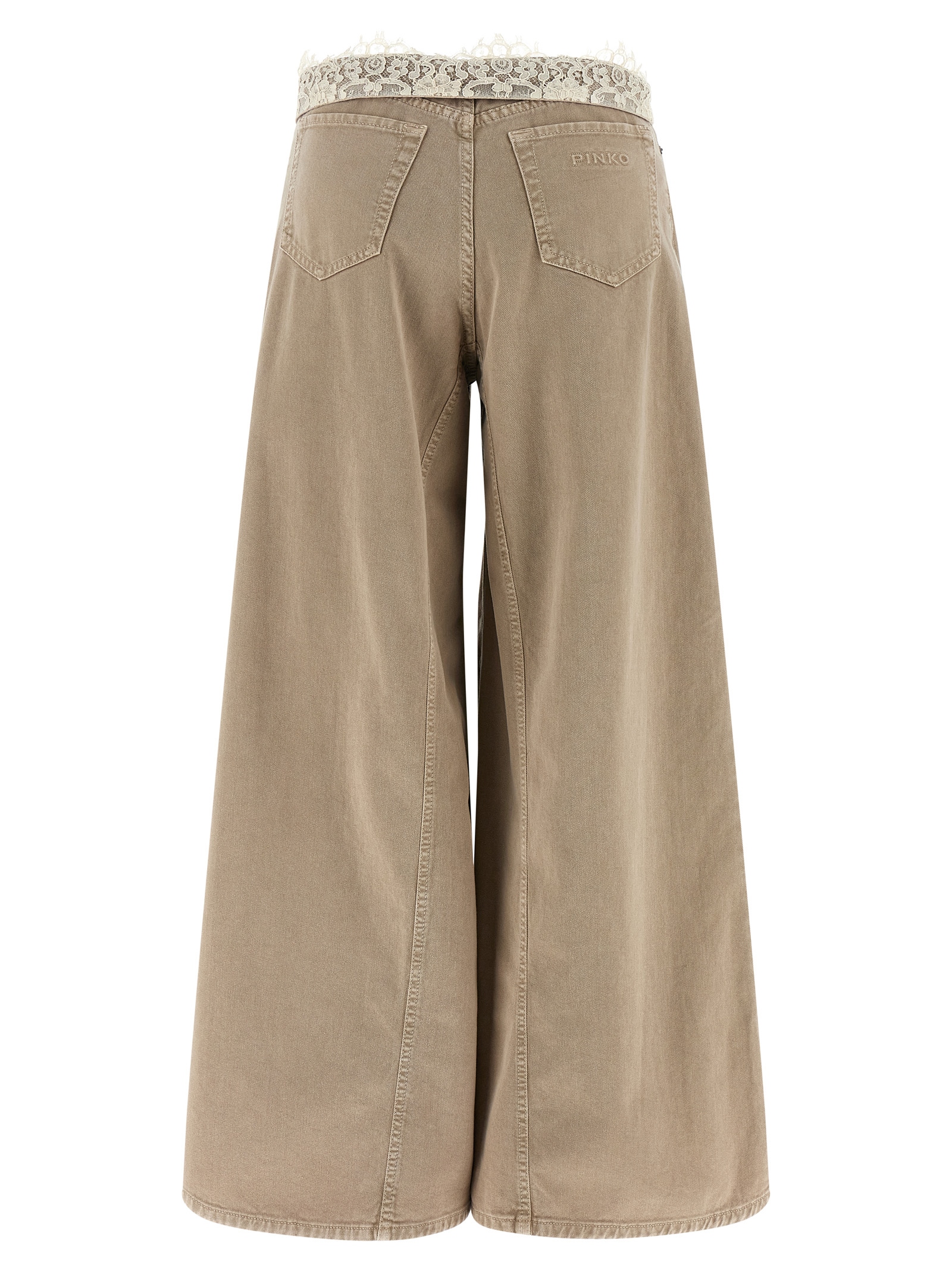 ‘Winona’ discolored-effect cotton bull denim jeans, extra wide leg, waist with contrast lace insert, pockets, zip and snap button closure that allows the model to be worn in two ways: high waist for a monochromatic effect or turned-up waist with lace in sight.