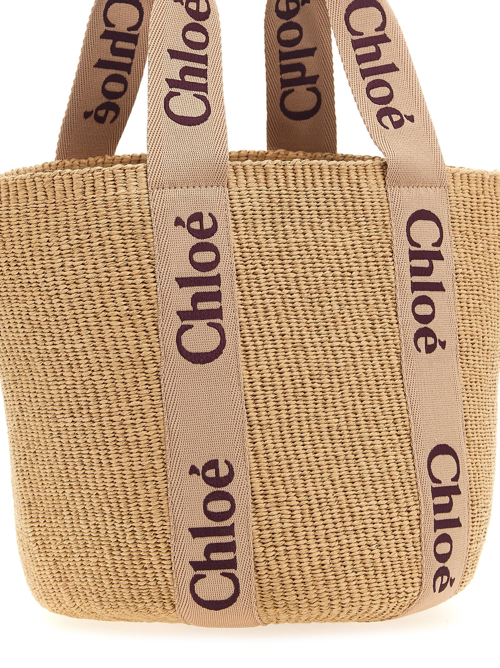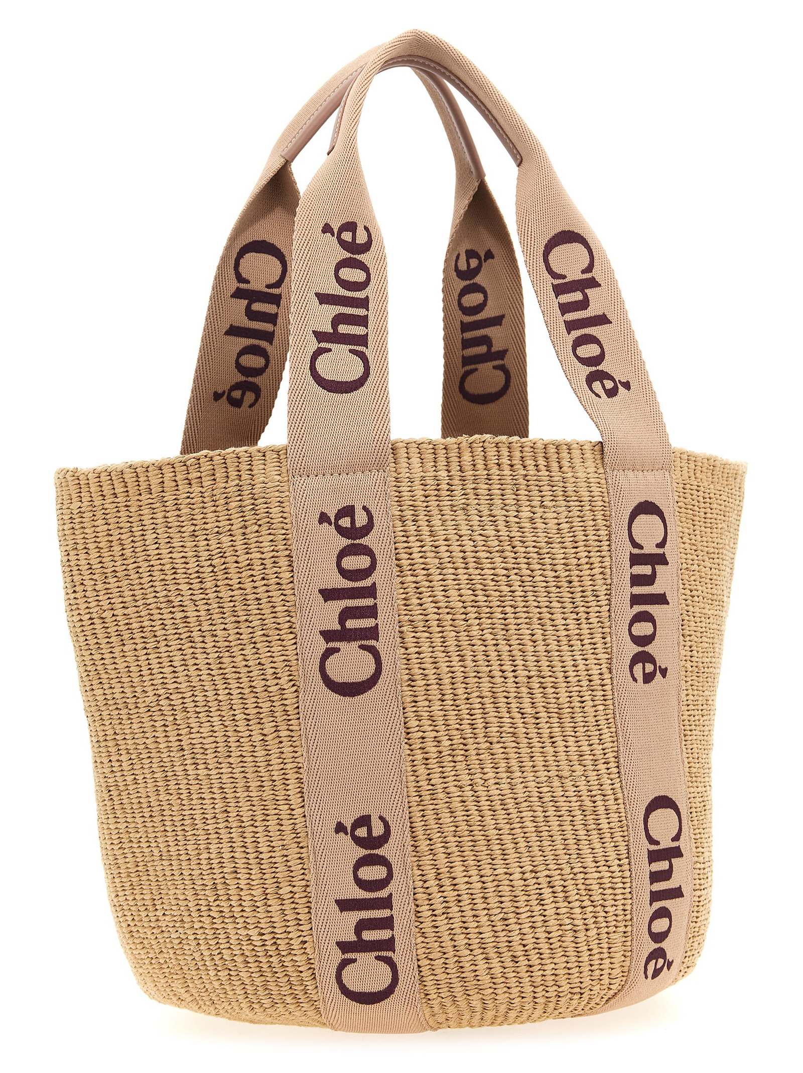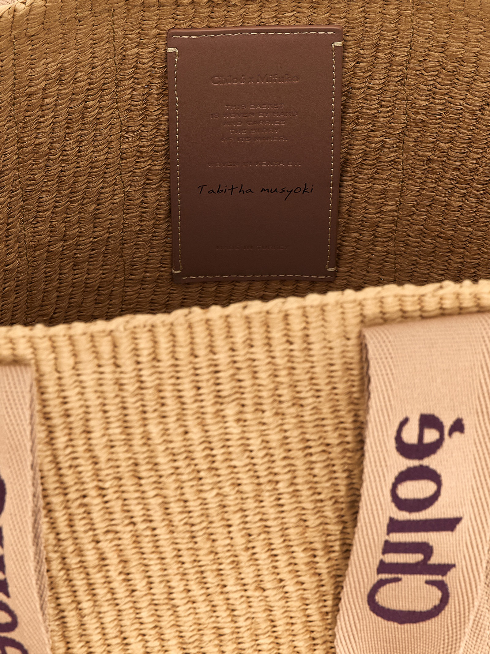 Large ‘Woody’ shopping bag handmade in fair trade paper by independent artisans in Kenya, double fixed handle in logo canvas, leather detail on the bottom of the bag.