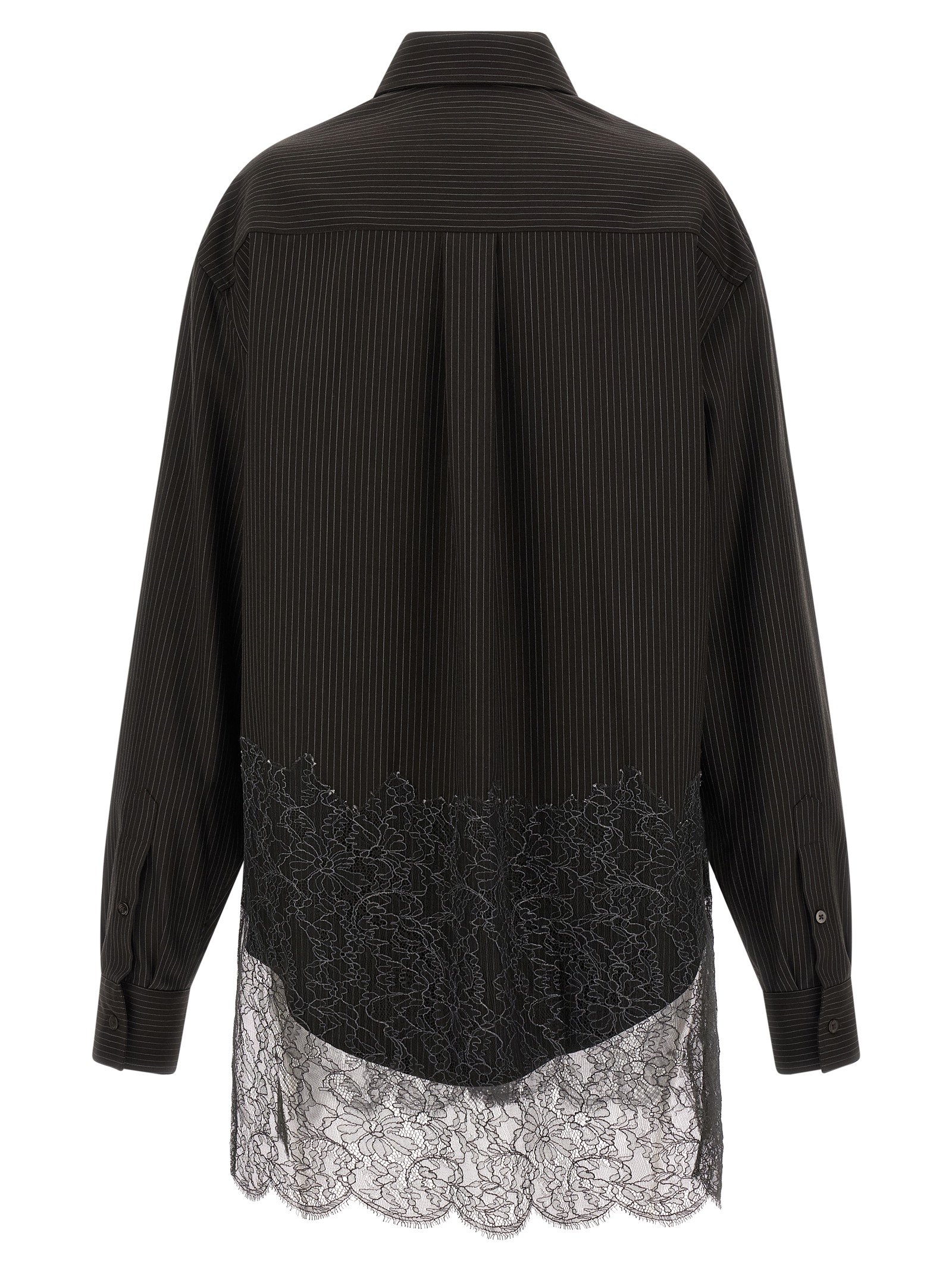 Pinstripe patterned wool shirt, button-down model, front button closure, long sleeves with cuffs and dropped shoulder, garment bottom with double layer lace insert, side slits.