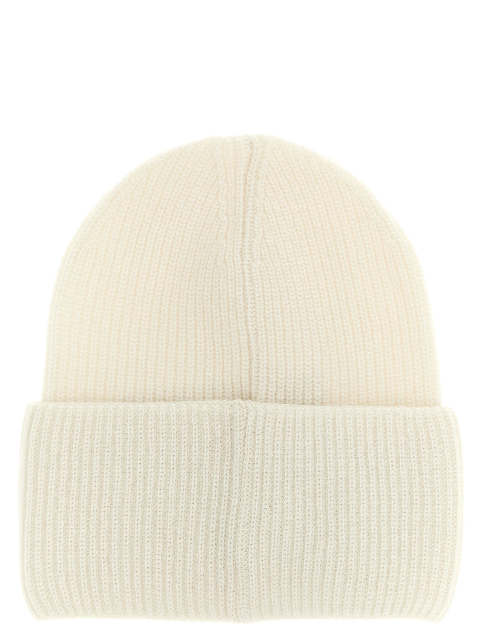 Carded wool knit beanie of medium weight 7 fineness and ribbed knit, turn-up with front felt logo patch.
