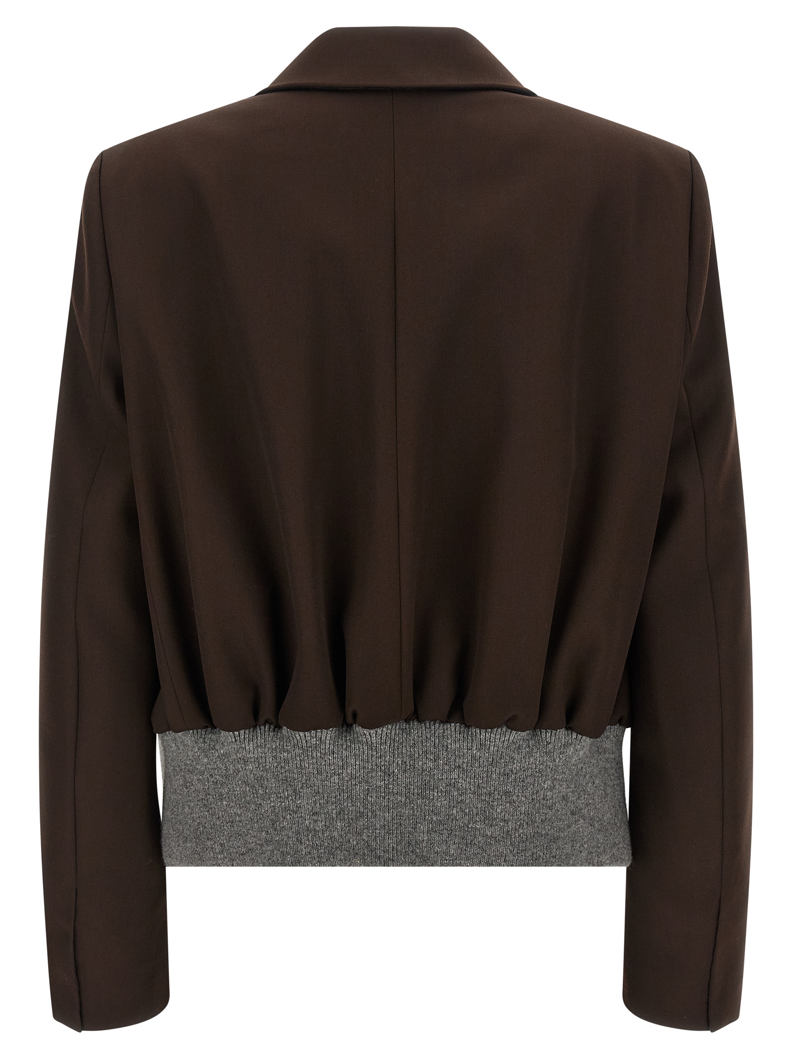 Fluid wool gabardine blazer jacket, contrast ribbed wool knit insert on the back, single-breasted style with front button closure, mirror lapels, breast pocket, flap pockets, structured shoulder strap, long sleeves, viscose lining.