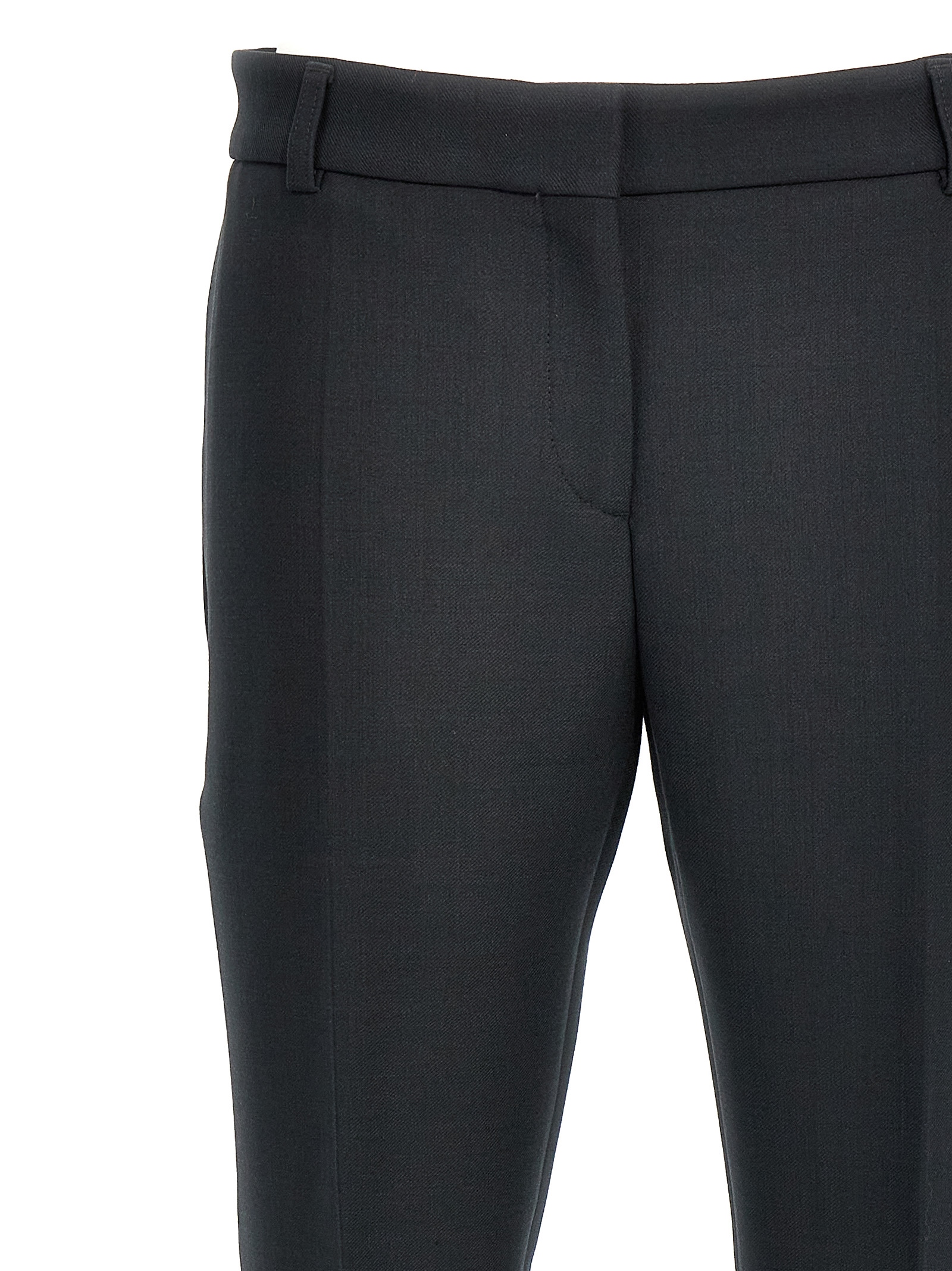 Wool blend trousers, low-waisted model with slim leg, hook and button zip closure, pockets.