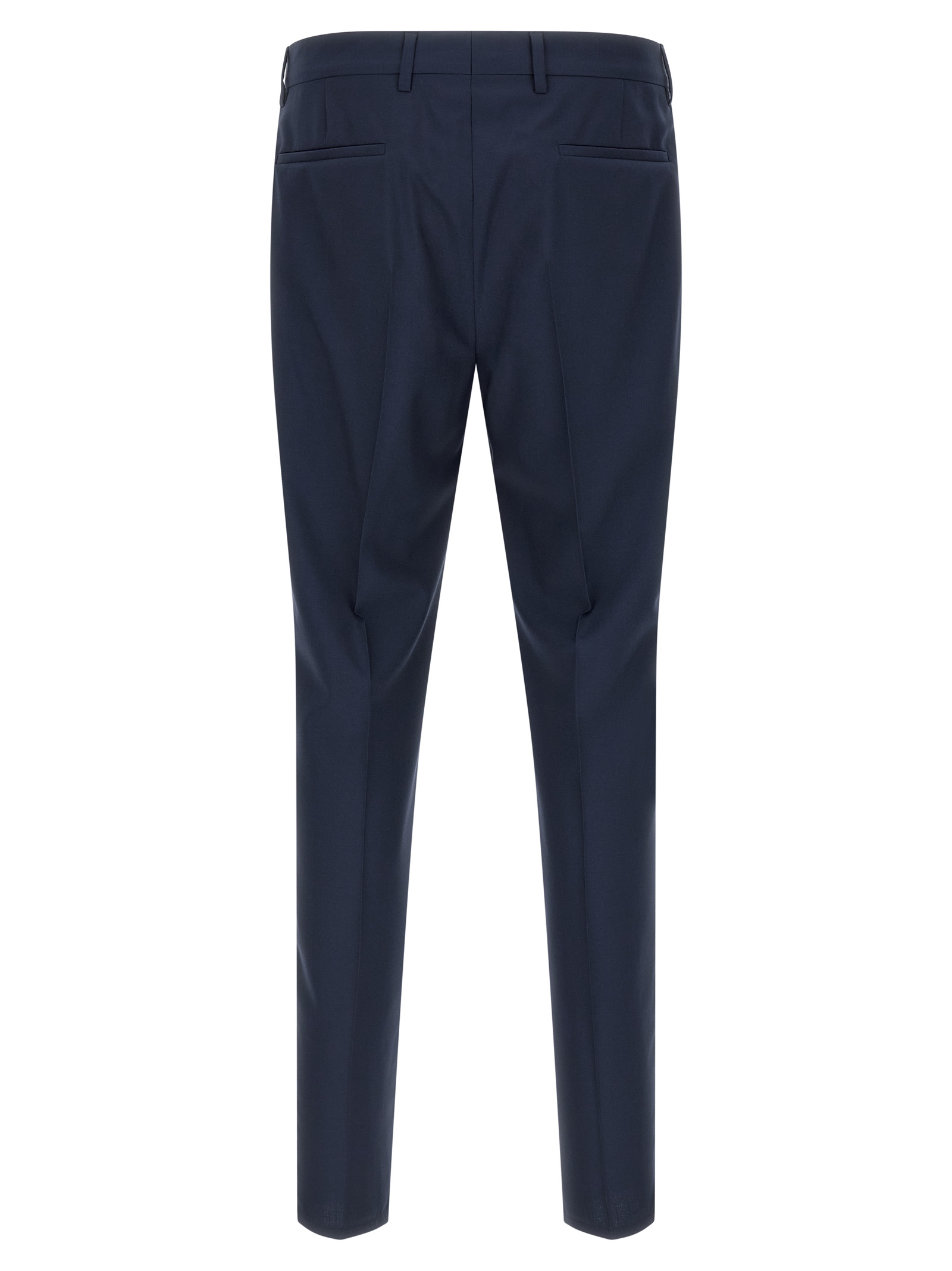 Virgin wool pants with soft silhouette on the pelvis with slightly lowered waist, pins, stretched pleat, zip closure, hook and front horn button, front American pockets, back welt pockets.