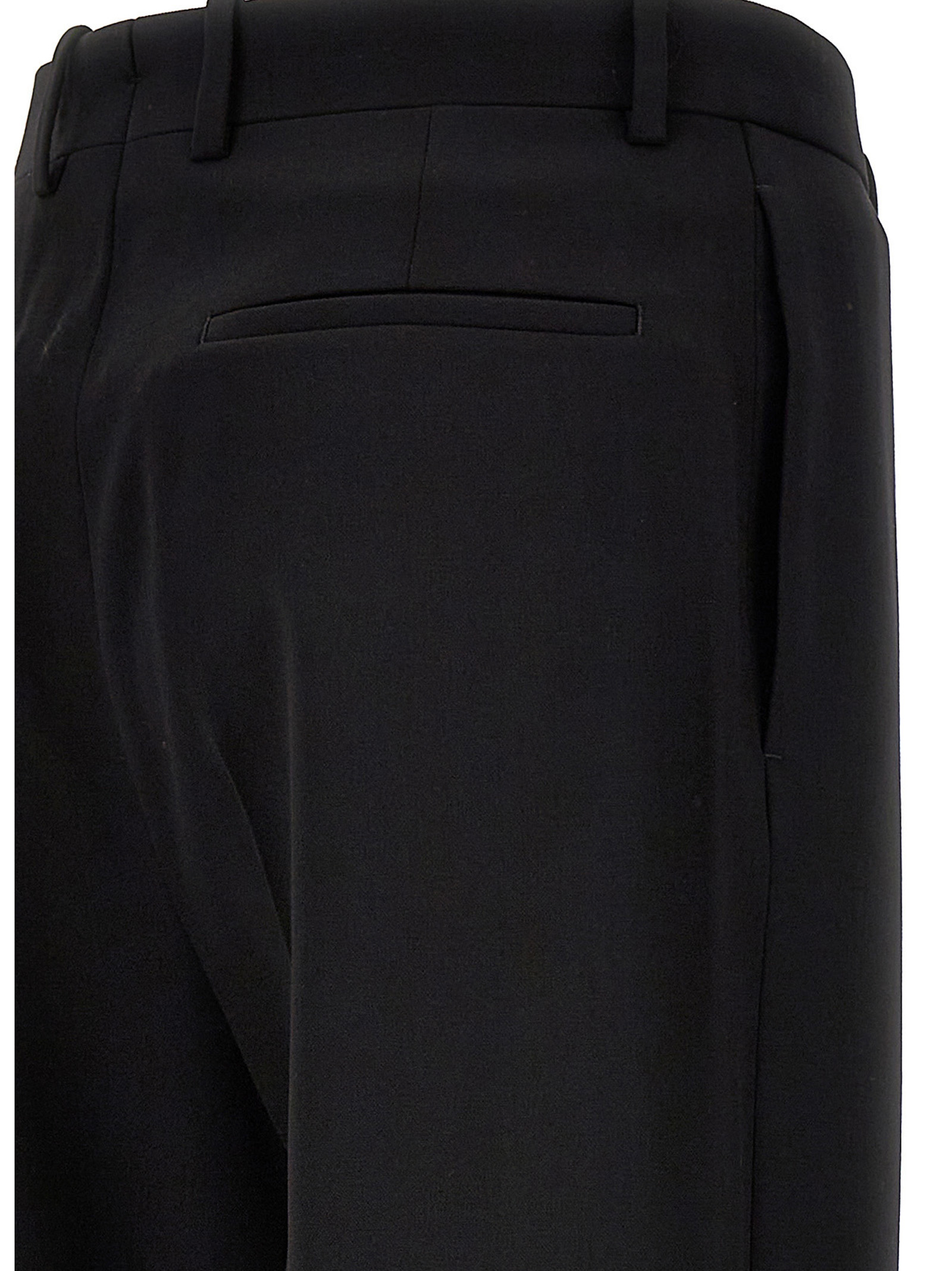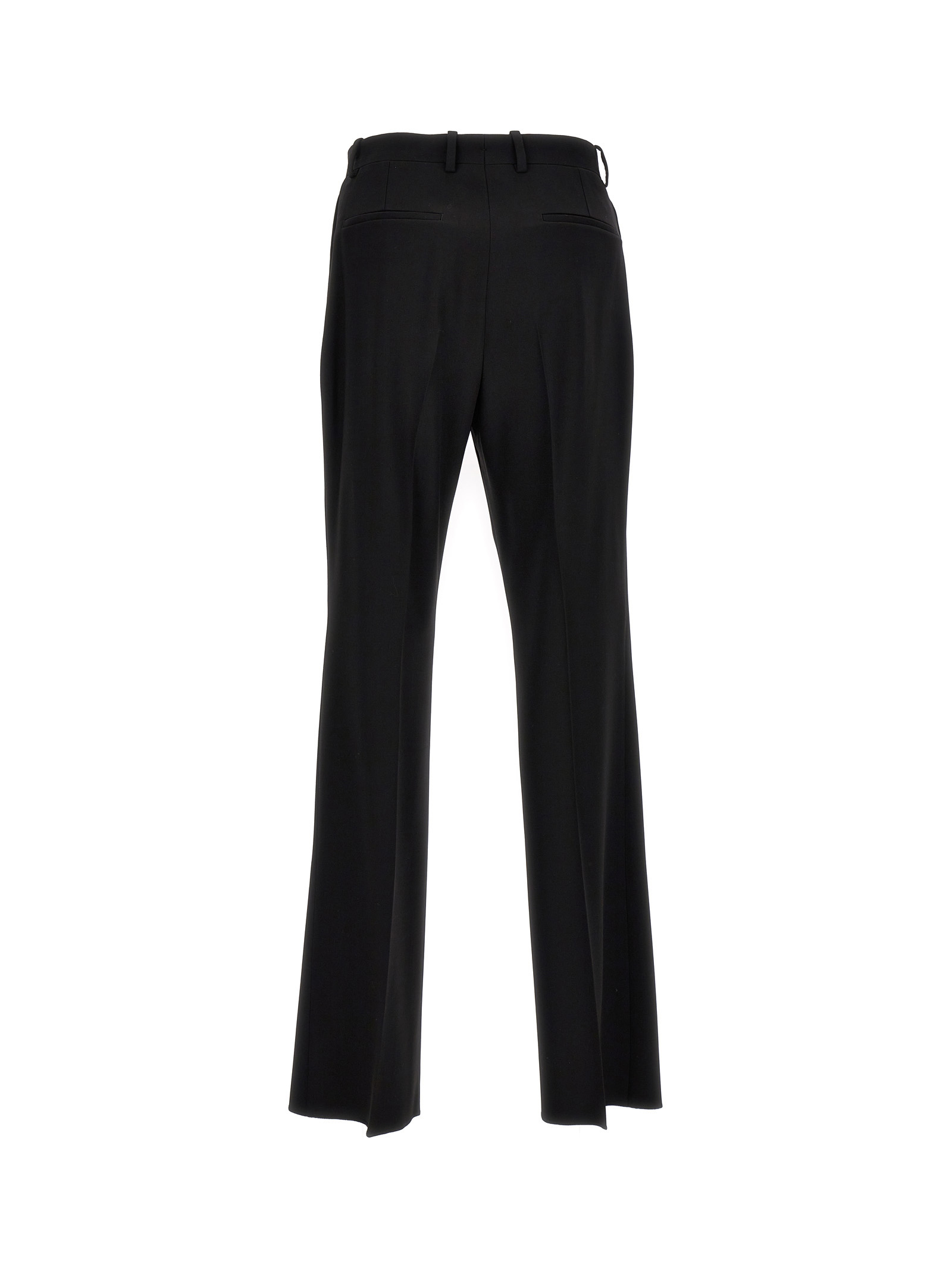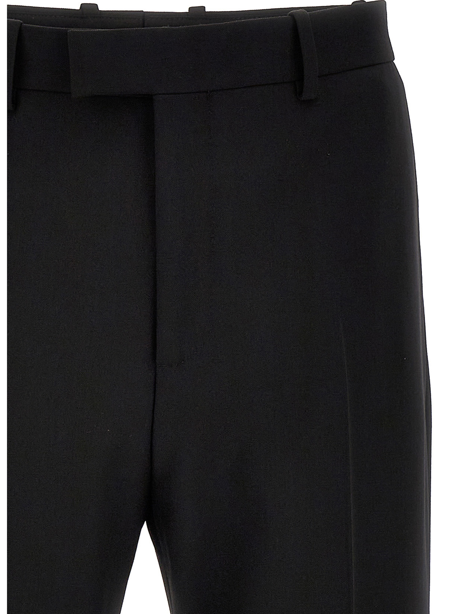 Wool pants with zip, hook-and-eye and button closure, straight leg with central crease and pockets.