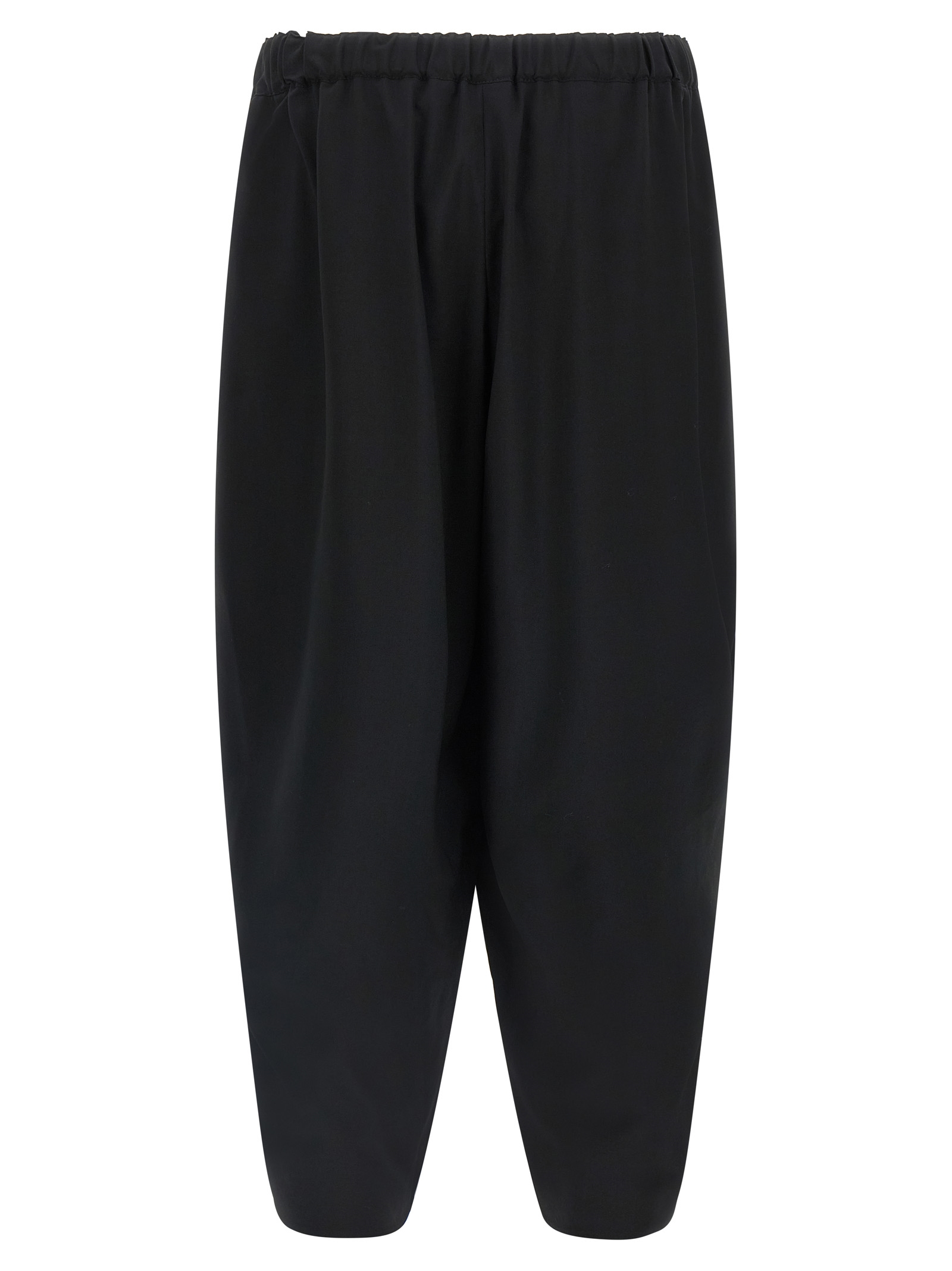 Light wool trousers, loose egg-shaped leg, pinces, low crotch, drawstring elastic waistband, pockets.