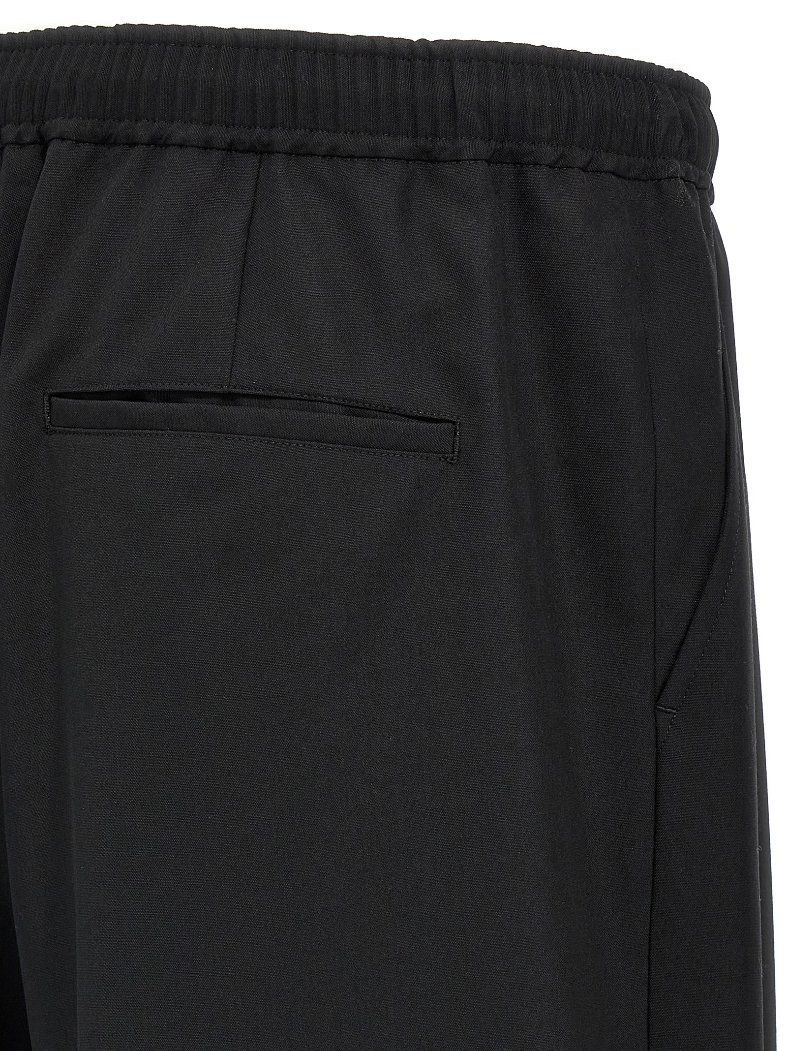 Wool trousers, wide and straight leg, pleats, elastic with adjustable drawstring at the waist, pockets.