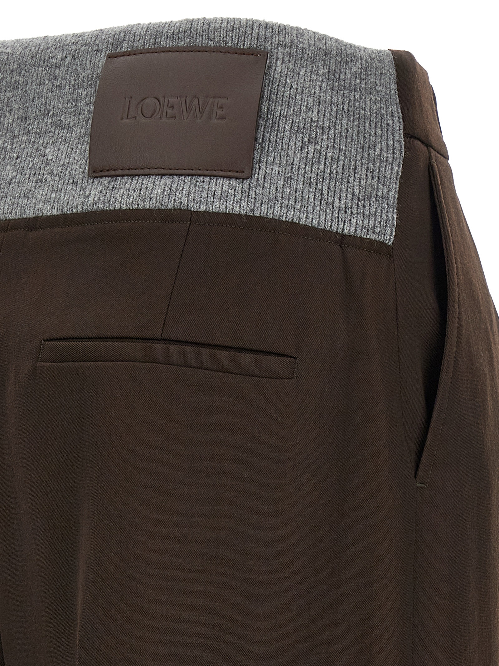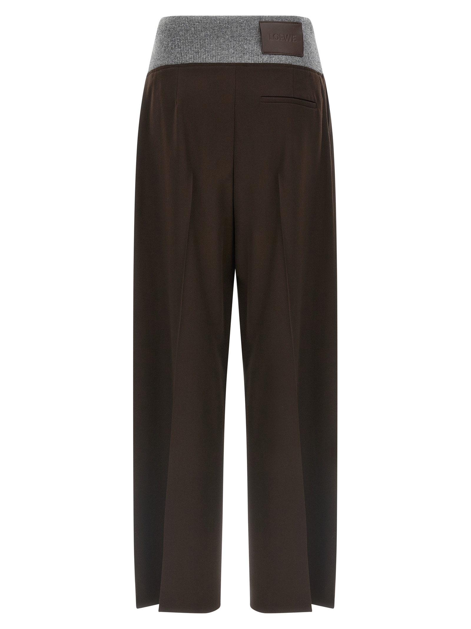 Fluid wool gabardine trousers, contrast ribbed wool knit insert at the back, front gusset pleats, mid waist, wide and straight leg, hook and button zip closure, pockets, leather patch with embossed logo on the back.