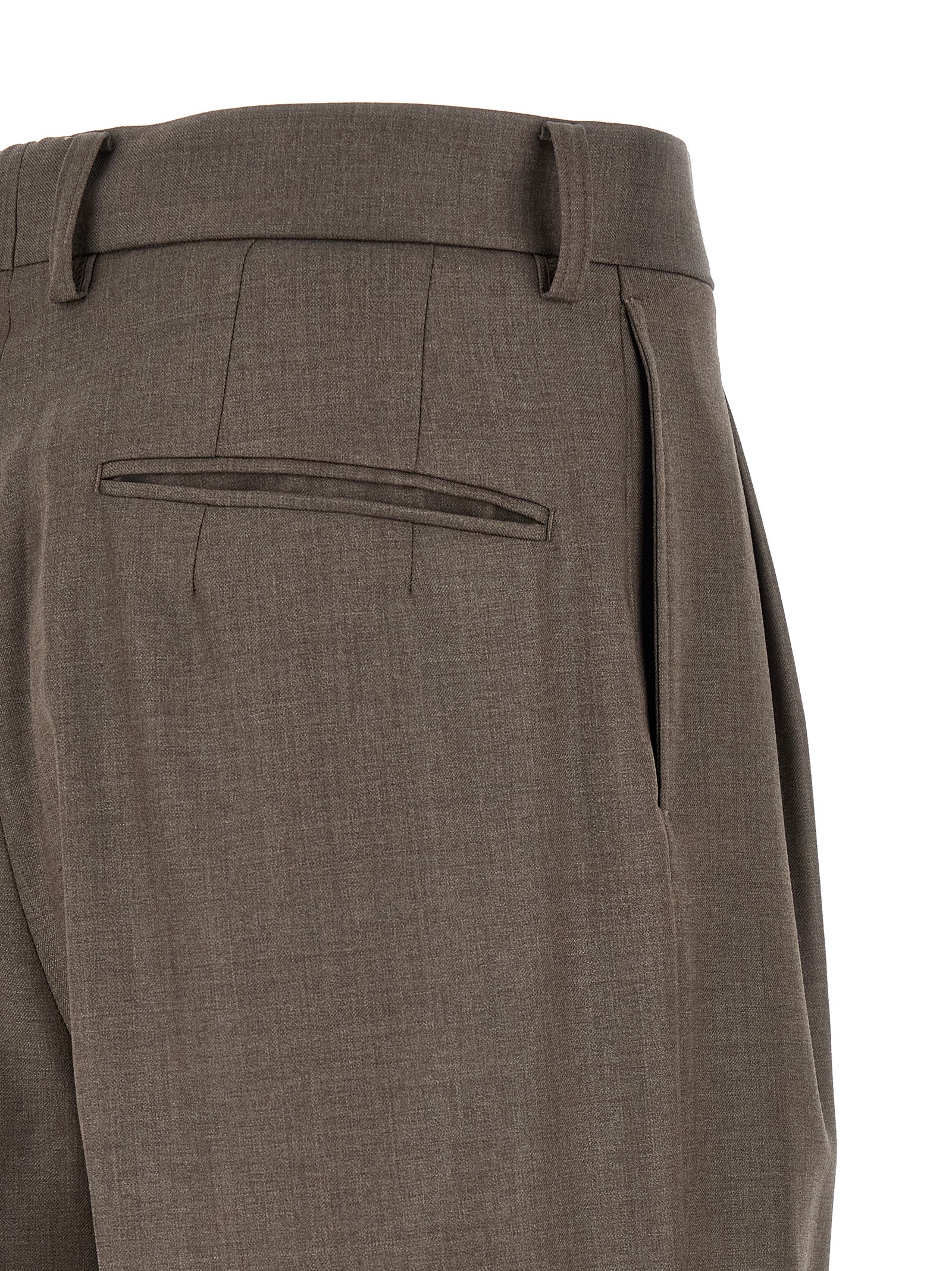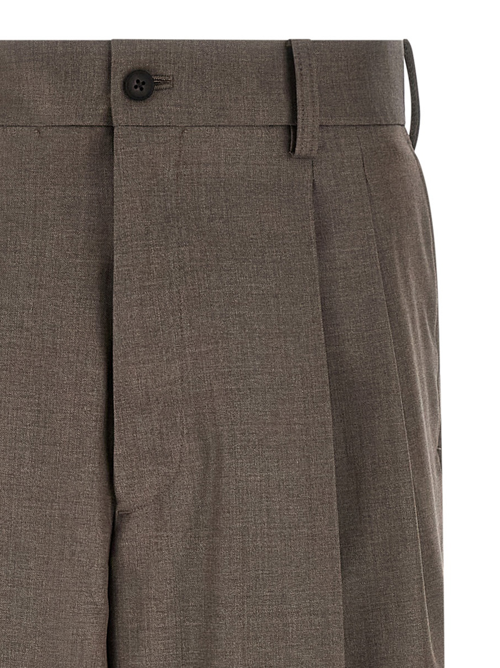 Light merino wool pants, formal model, wide leg with front pleats, front stretched pleat, front zip and button closure, side and back welt pockets, belt with loops.