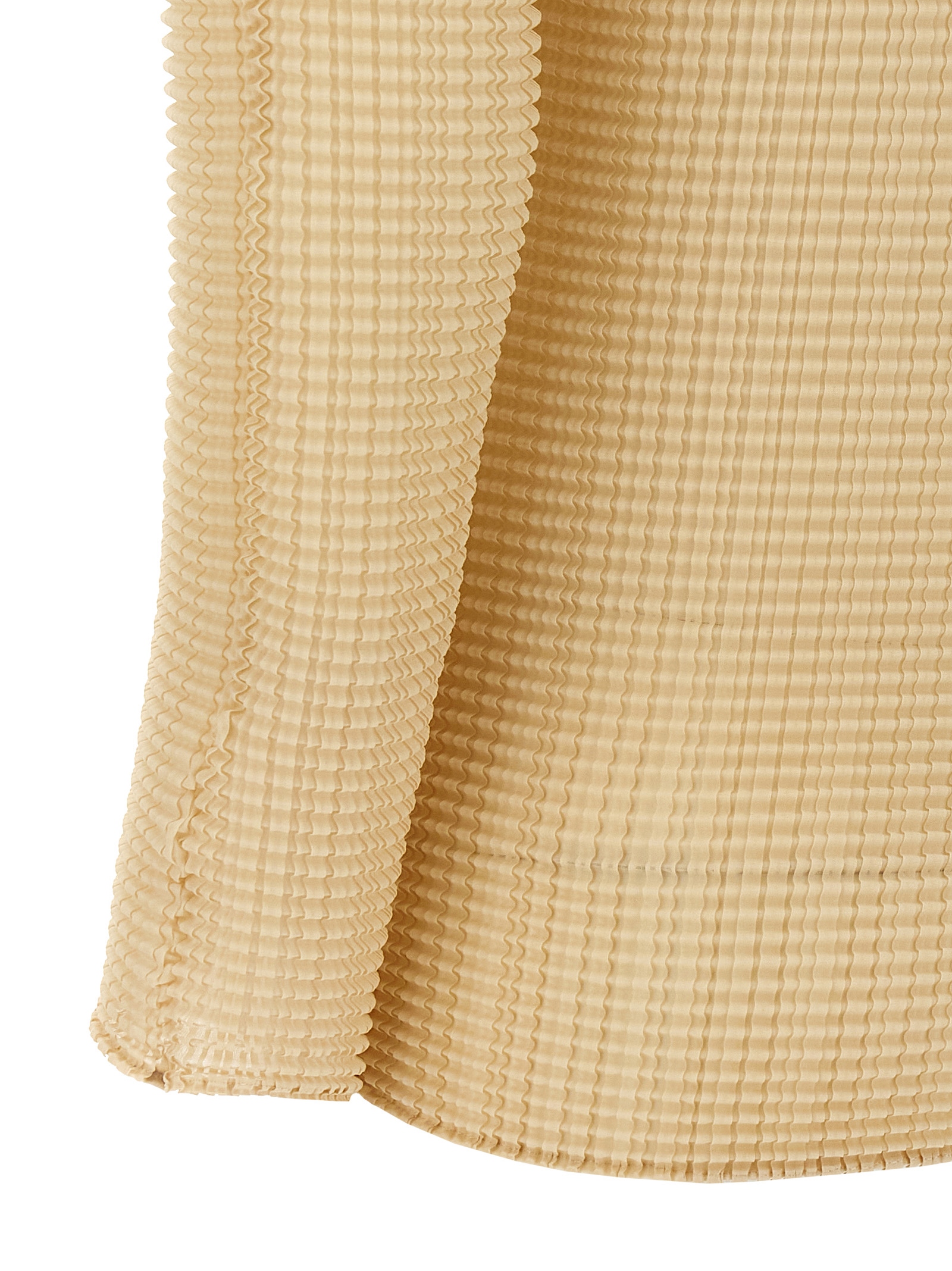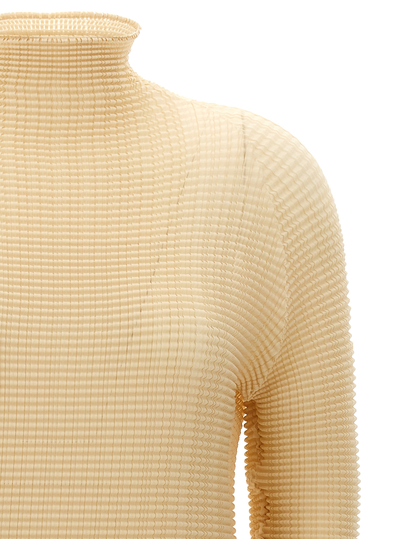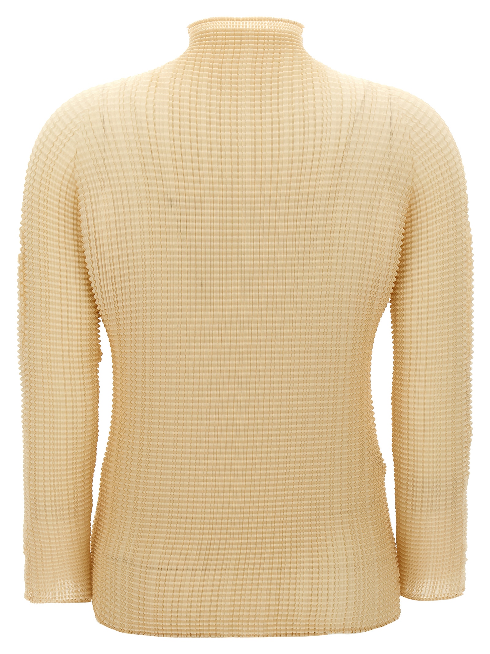 ‘Wooly Pleats-56’ pleated fabric blouse with high neck and long sleeves.
