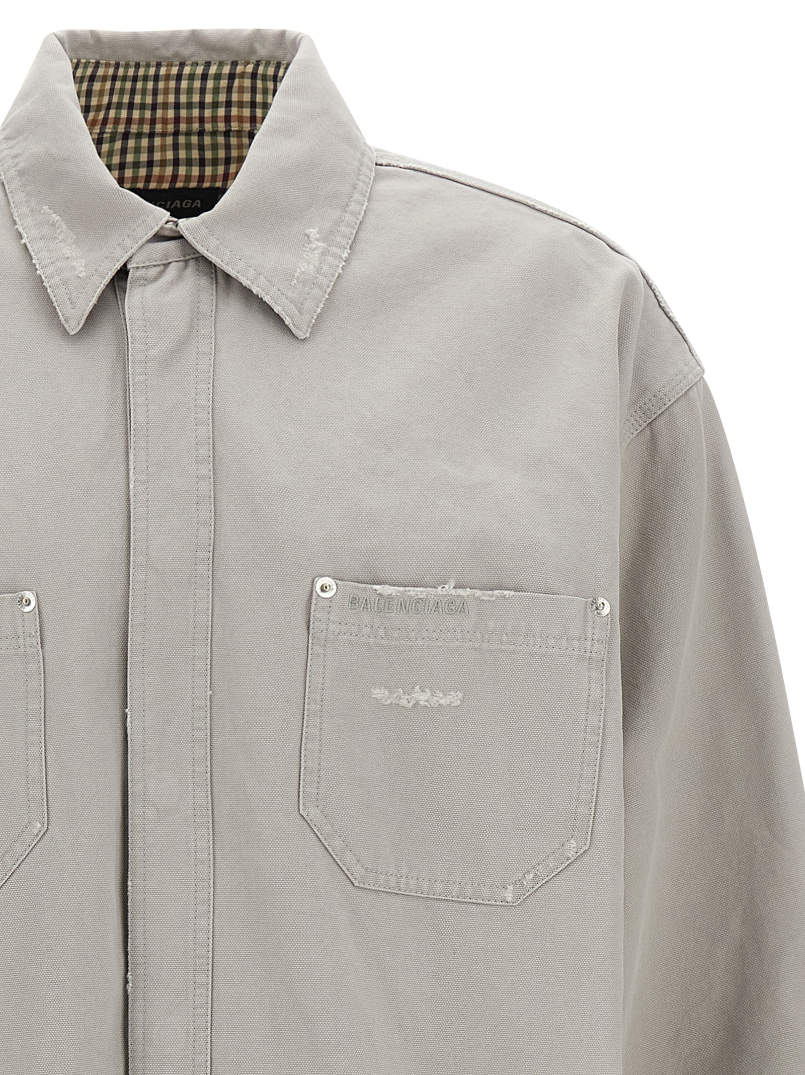 ‘Workwear’ overshirt in heavy used-effect cotton canvas, contrasting patterned cotton lining, tone-on-tone logo embroidery and front snap button closure, pockets, long sleeves with cuffs and dropped shoulders.