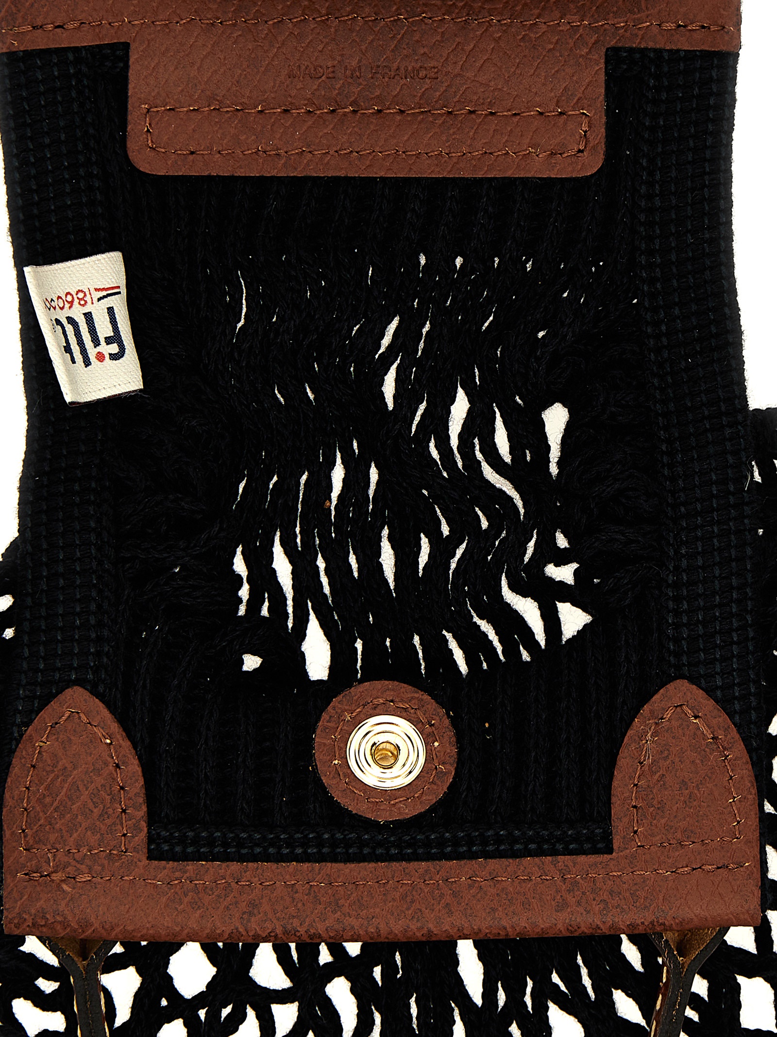 in cotton mesh, leather handle, leather flap with snap button closure and embossed logo, shoulder strap.