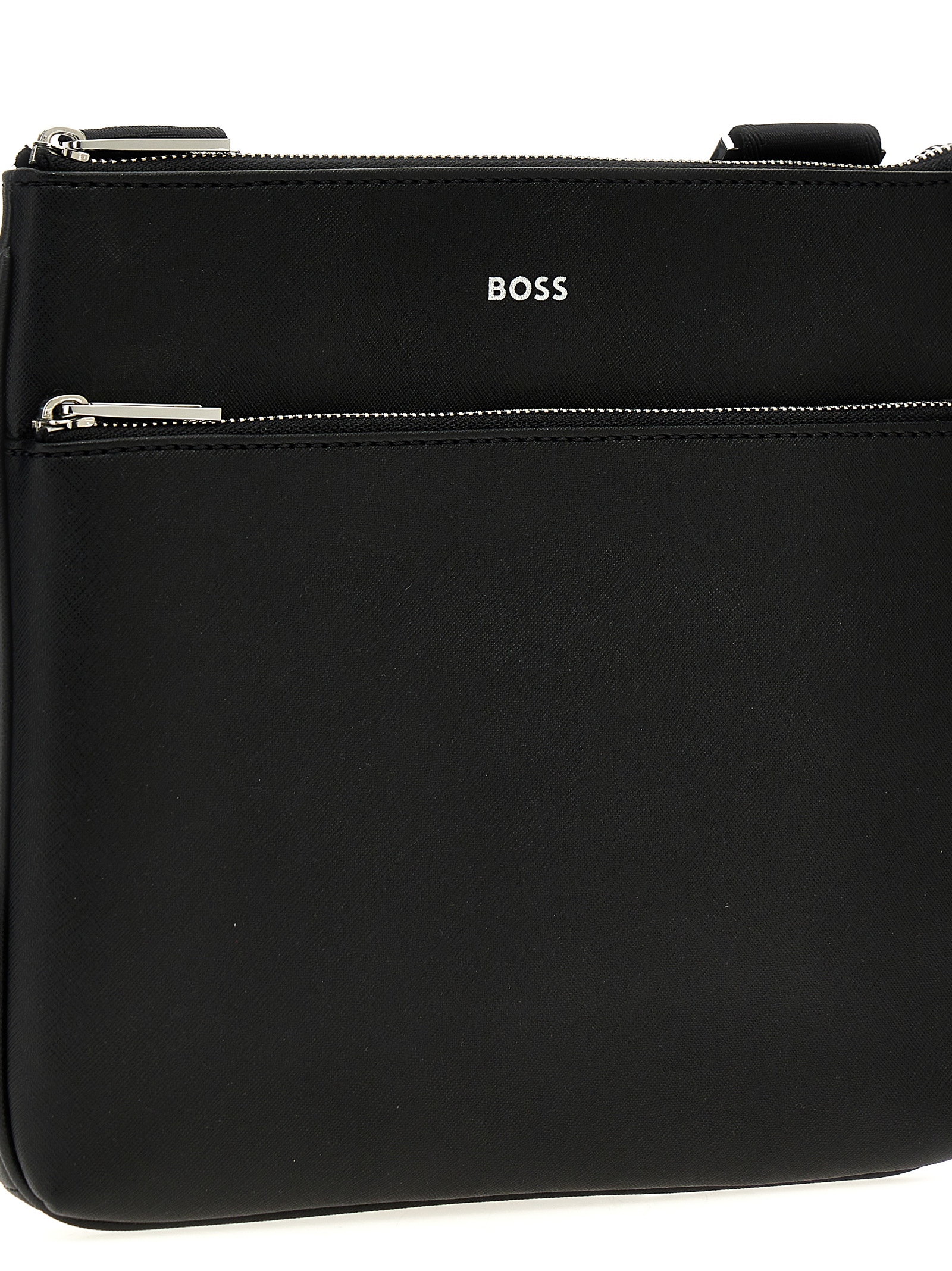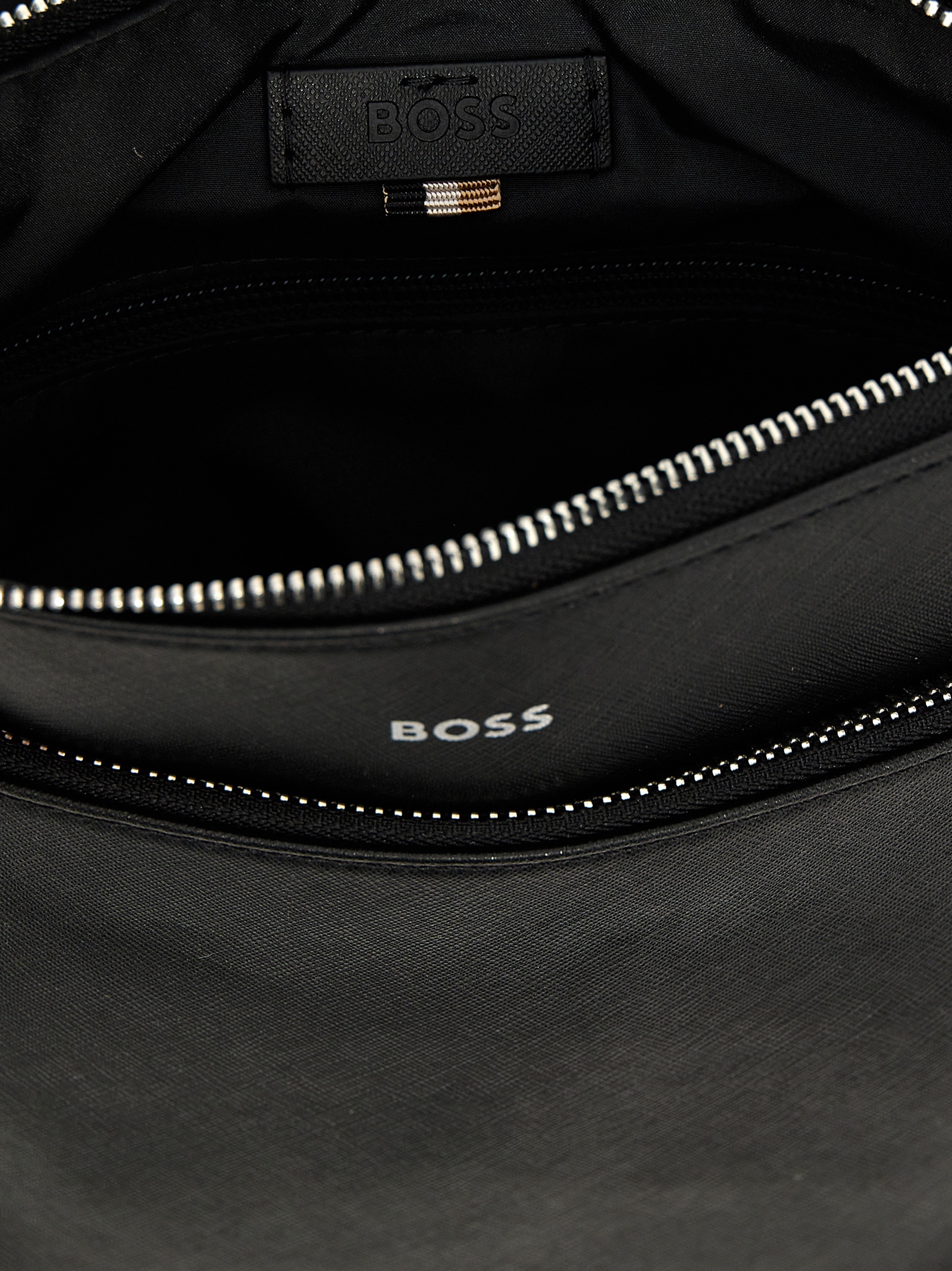 ‘Zair S’ regenerated leather crossbody bag, adjustable fabric shoulder strap, front embossed logo, zip closure, pocket.