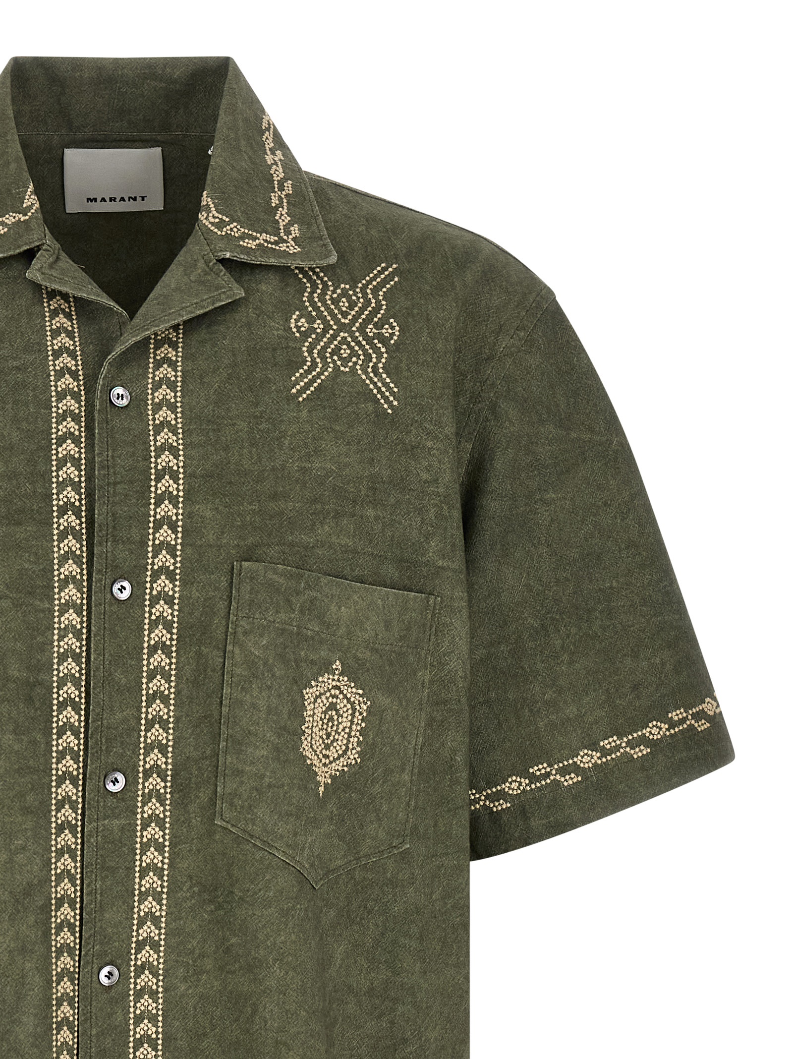 ‘Zekim’ cotton gauze shirt with contrasting embroidery, bowling style, breast pocket, front button closure, short sleeves with dropped shoulders, side slits, asymmetrical hem.
