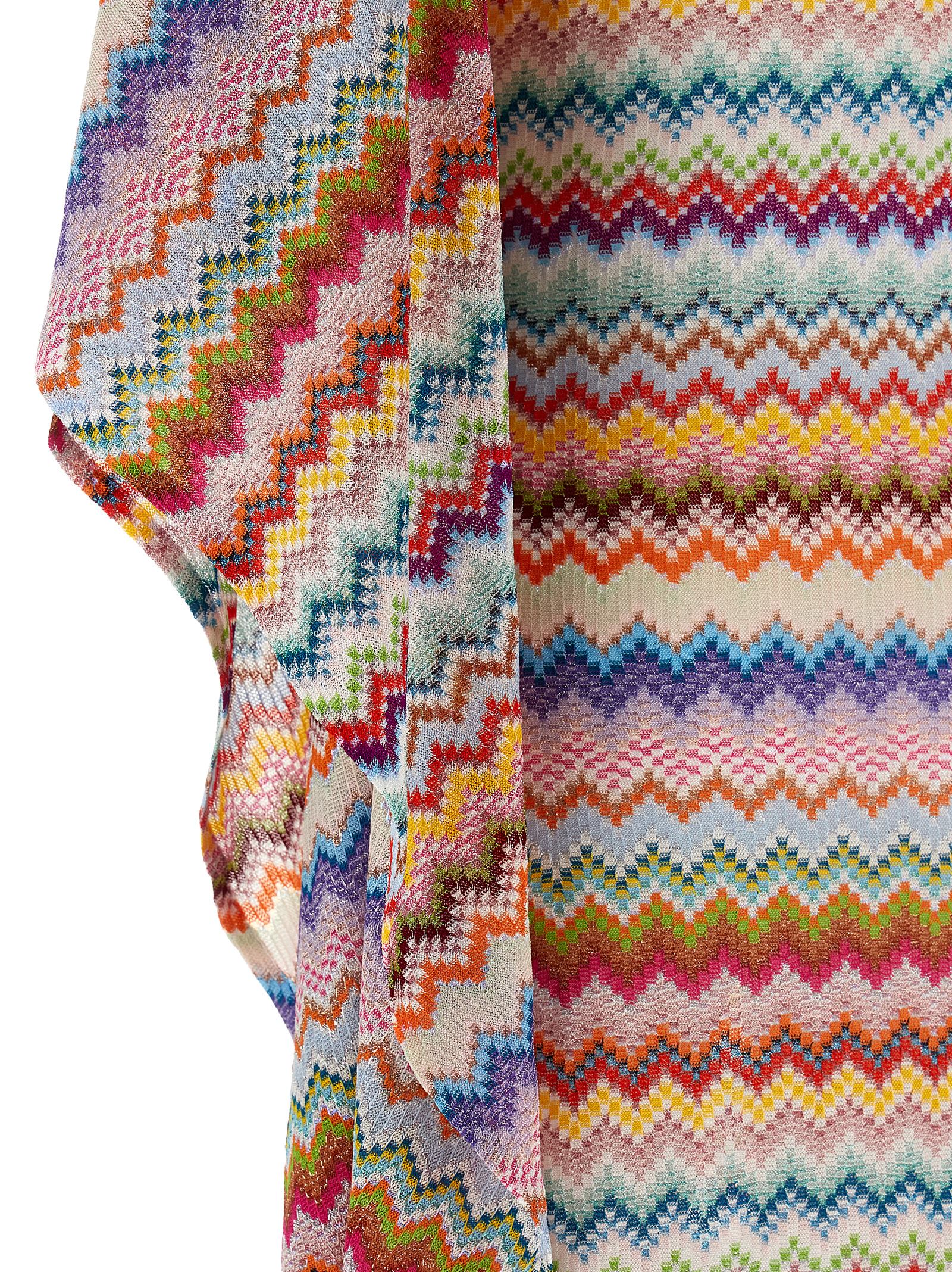 Long semi-transparent knit dress with zigzag pattern, V-neck kaftan style with wide bat sleeves.