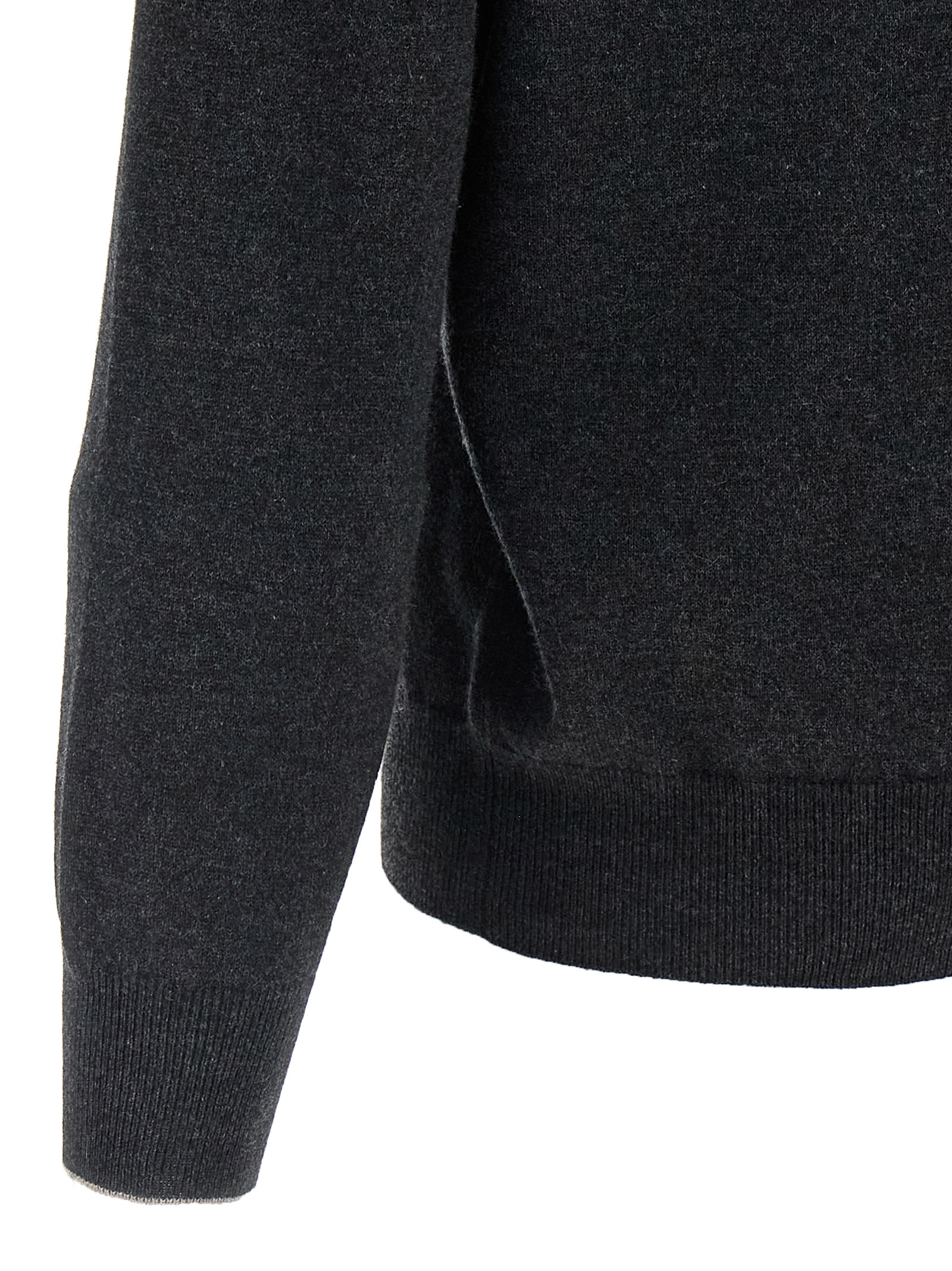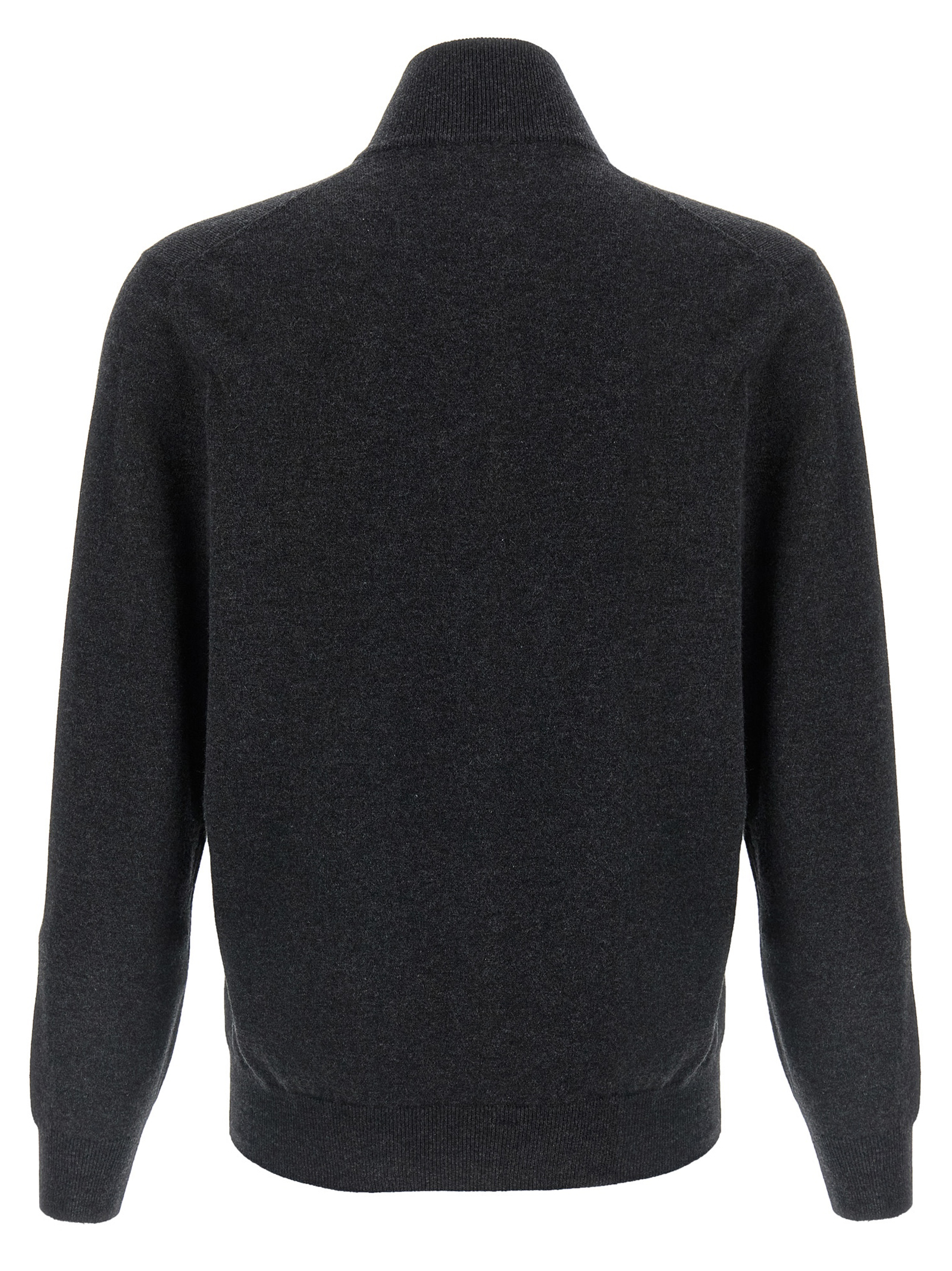 Cashmere cardigan with contrasting details, high neck, front zip closure, long cuffed sleeves.