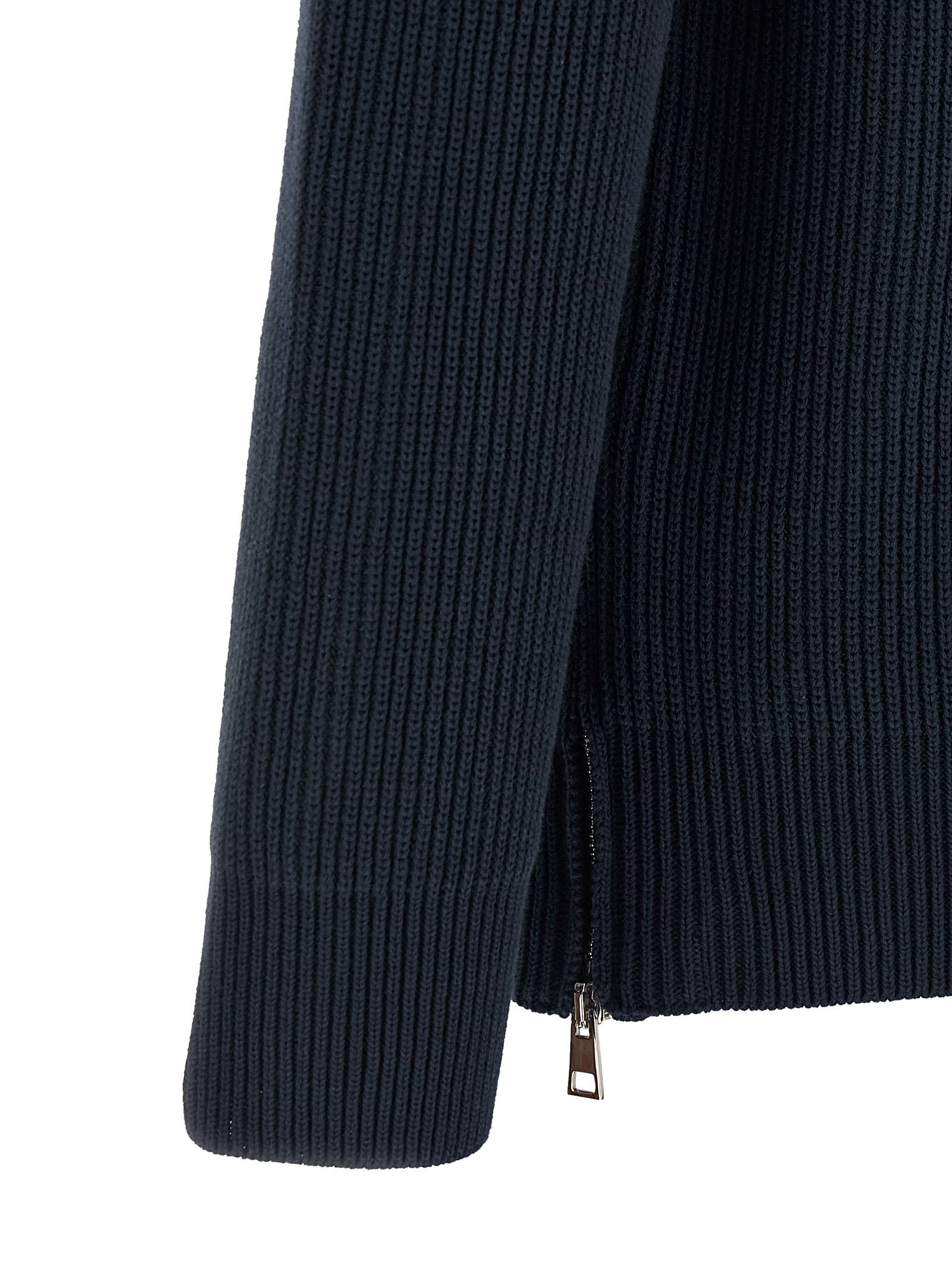 Ribbed knit cotton sweater, high neck, front asymmetrical zip closure, long cuffed sleeves.