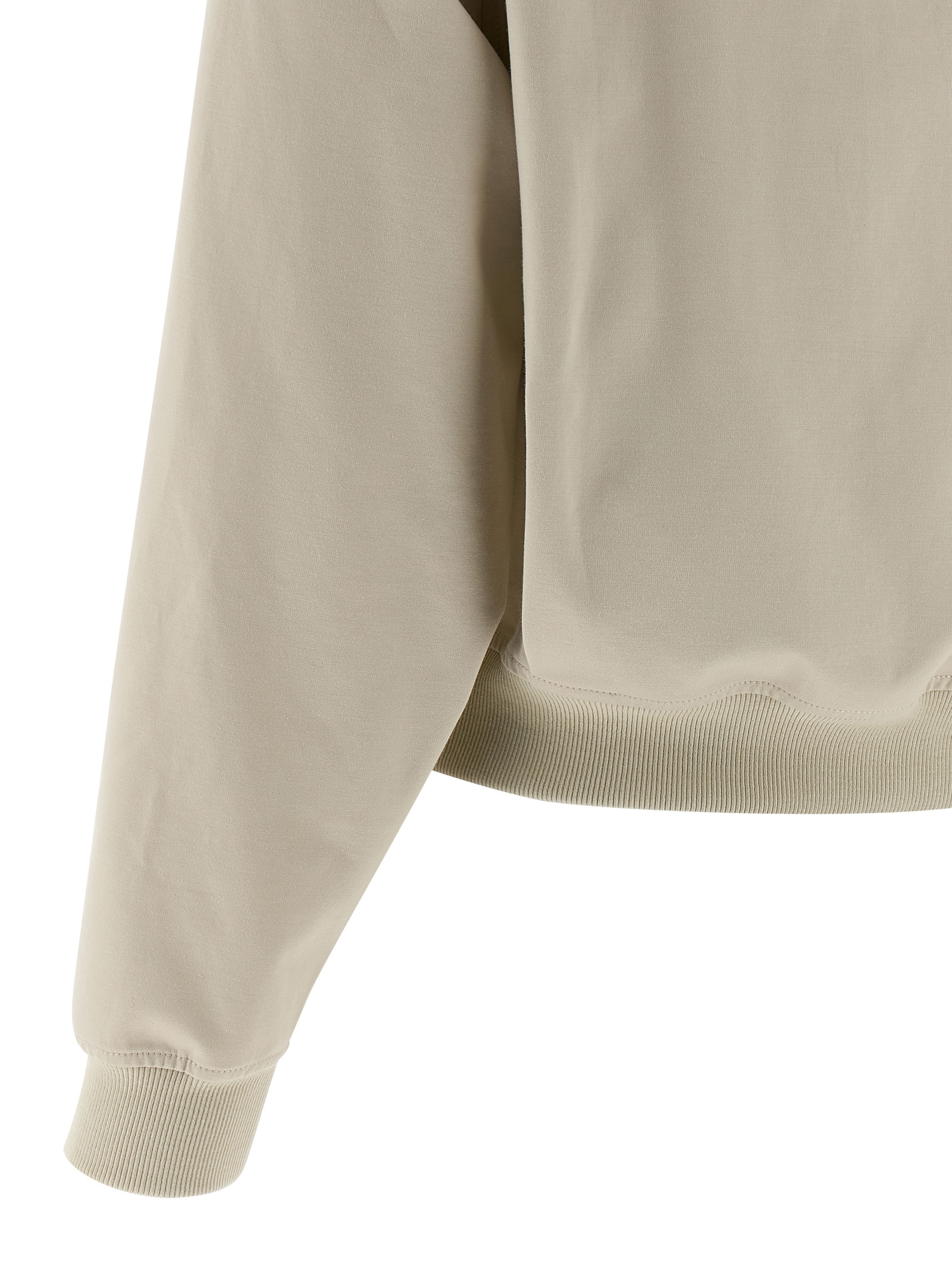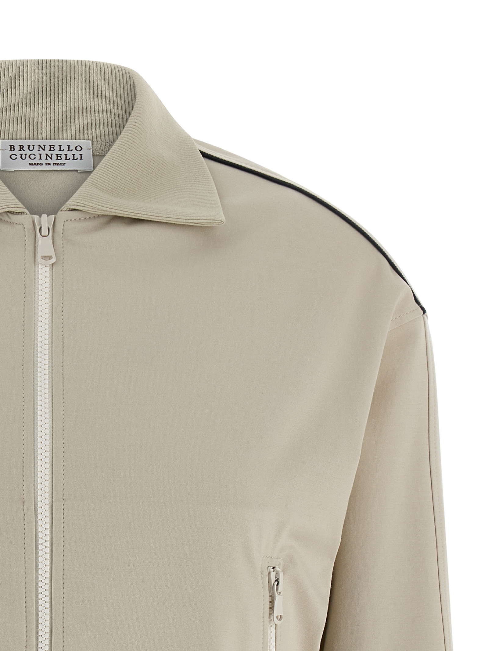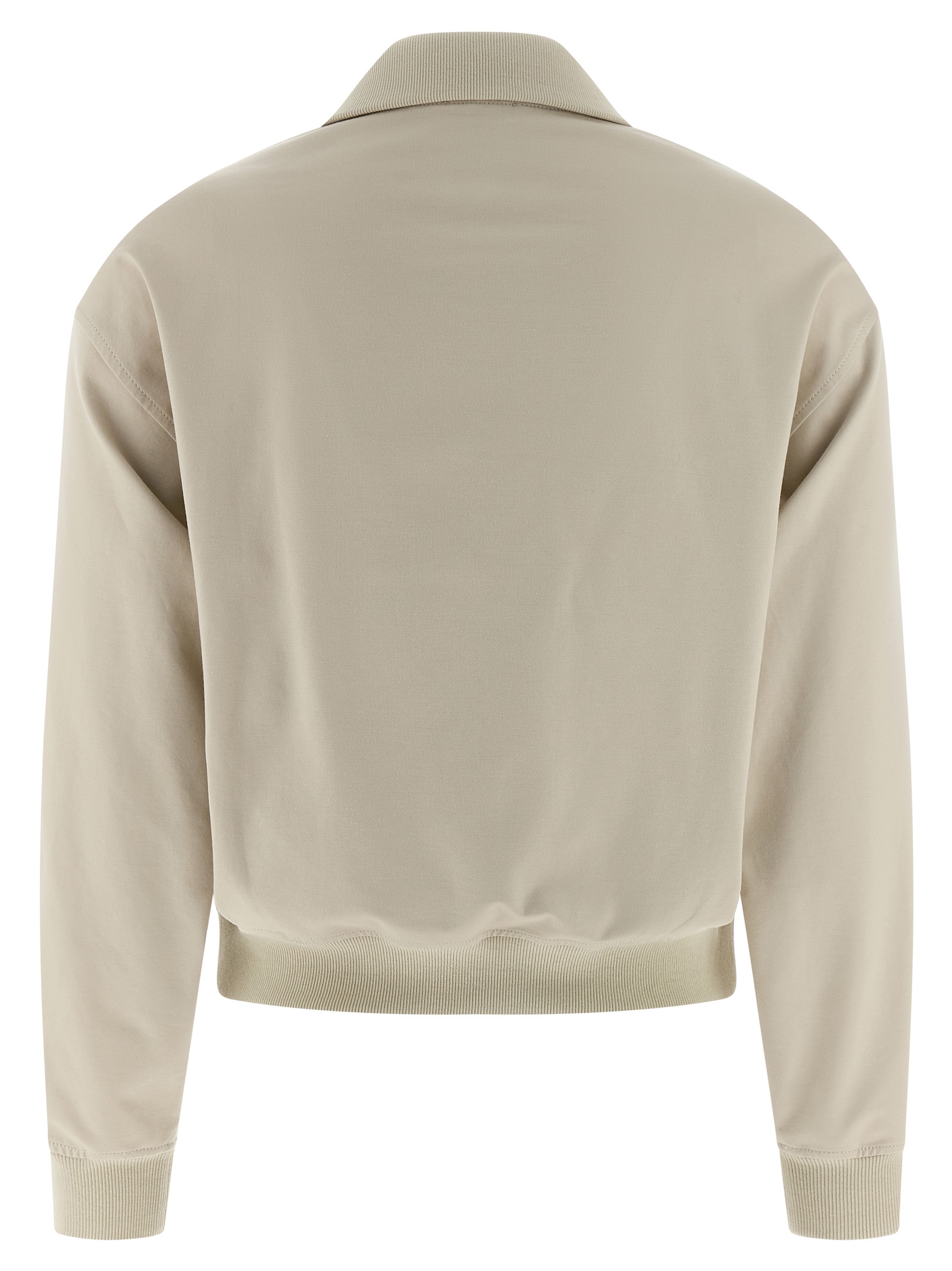 Stretch cotton sweatshirt, knitted collar, front zip closure, side pockets, long sleeves with knitted cuffs.